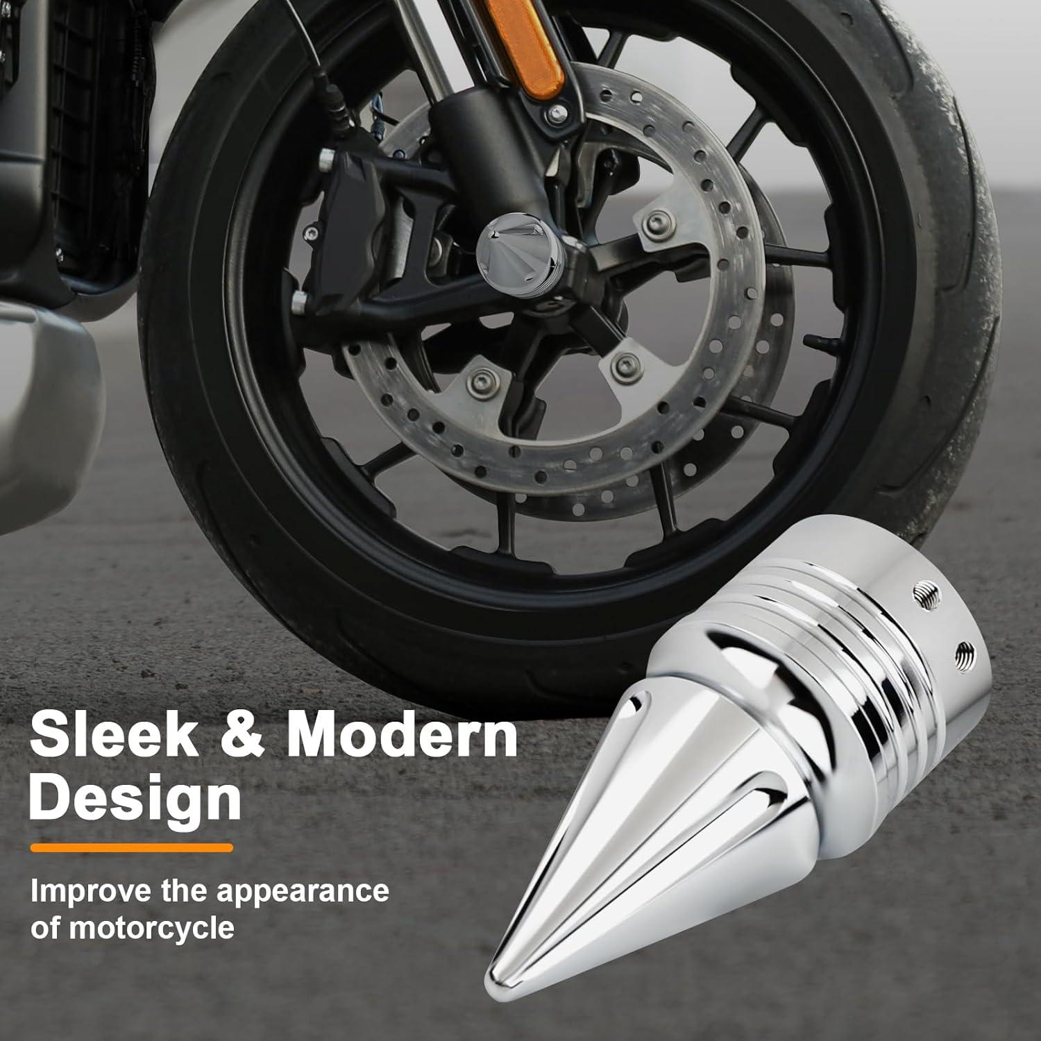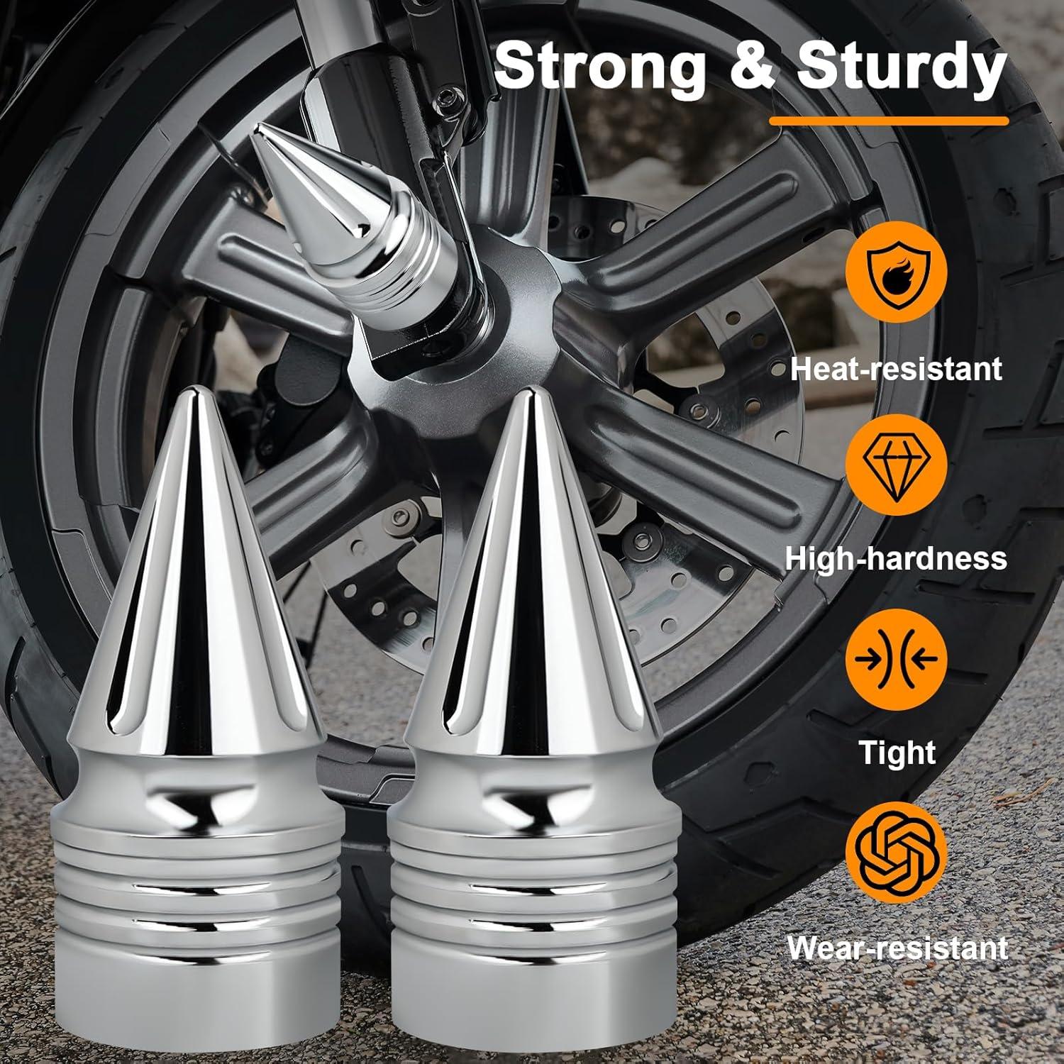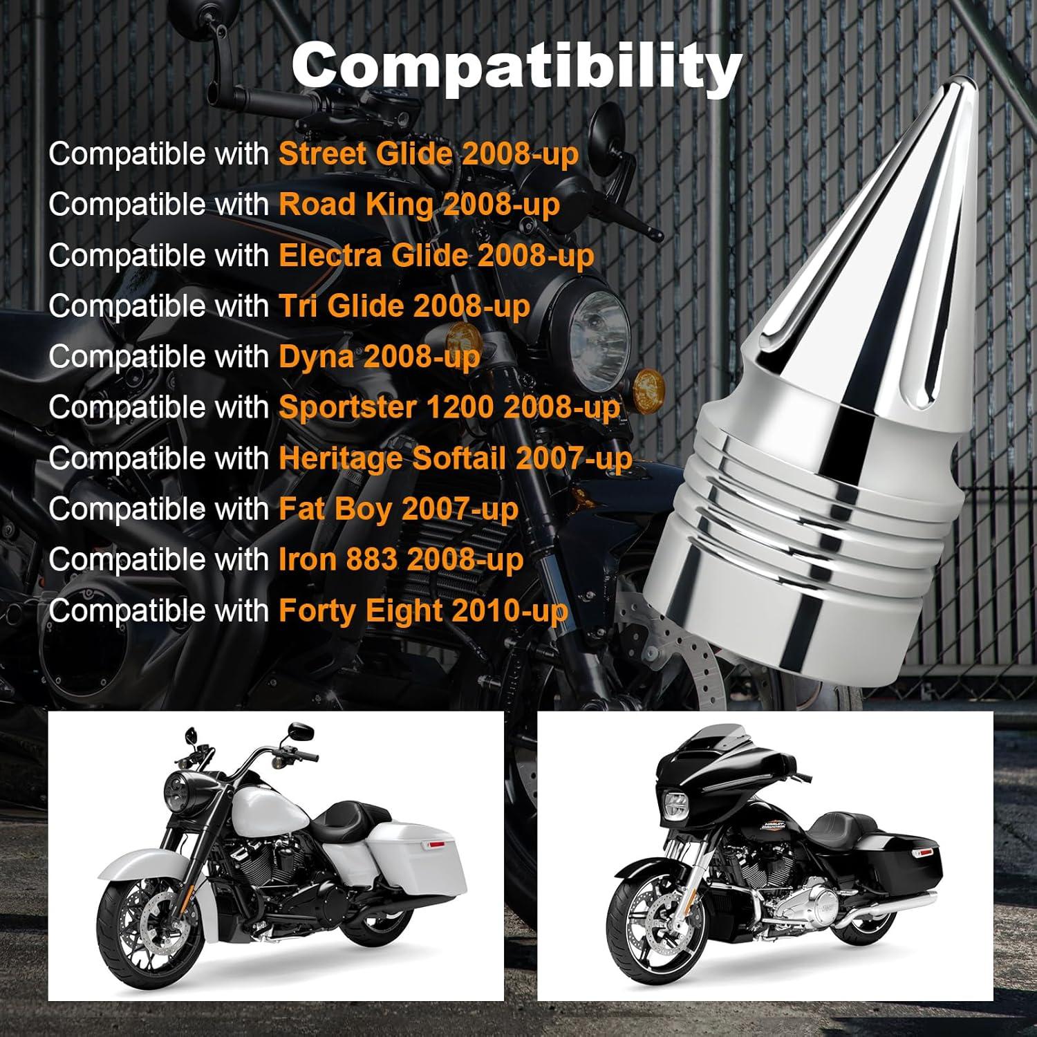Fitment: Front axle nut covers compatible with Street Glide 2008-up, Dyna 2008-up, Road King 2008-up, Electra Glide 2008-up, Tri Glide 2008-up, Sportster 1200 2008-up, Heritage Softail 2007-up, Fat Boy 2007-up, Iron 883 2008-up, Forty Eight 2010-up