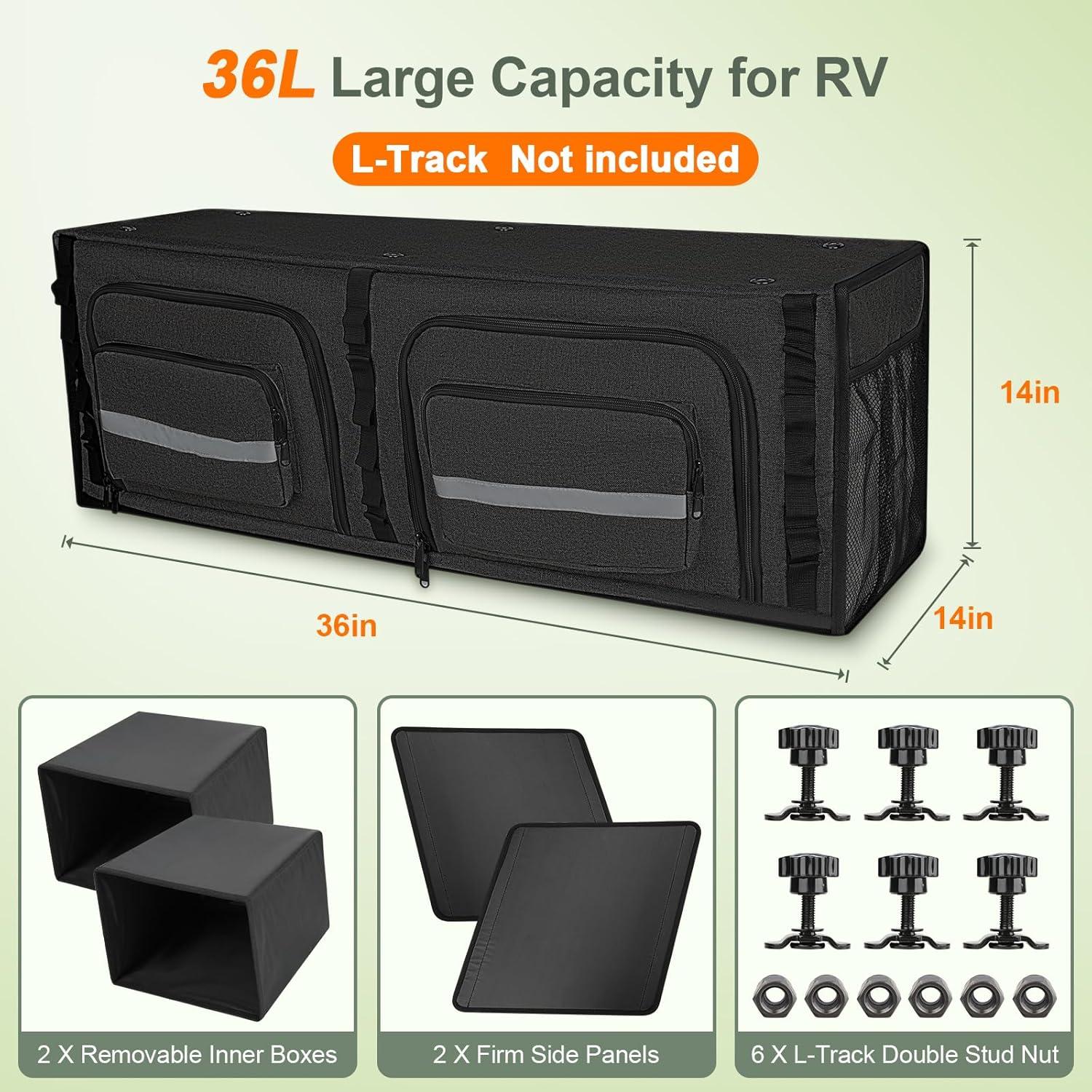 Cabinet's Size: This storage cabinet measures 36 inches wide, 14 inches high, and 14 inches deep. We provide 6 pieces of L-track double lug threaded stud nuts for you to install the cabinet on the roof. Note: Pre-installation of L-tracks(not included) is required before mounting