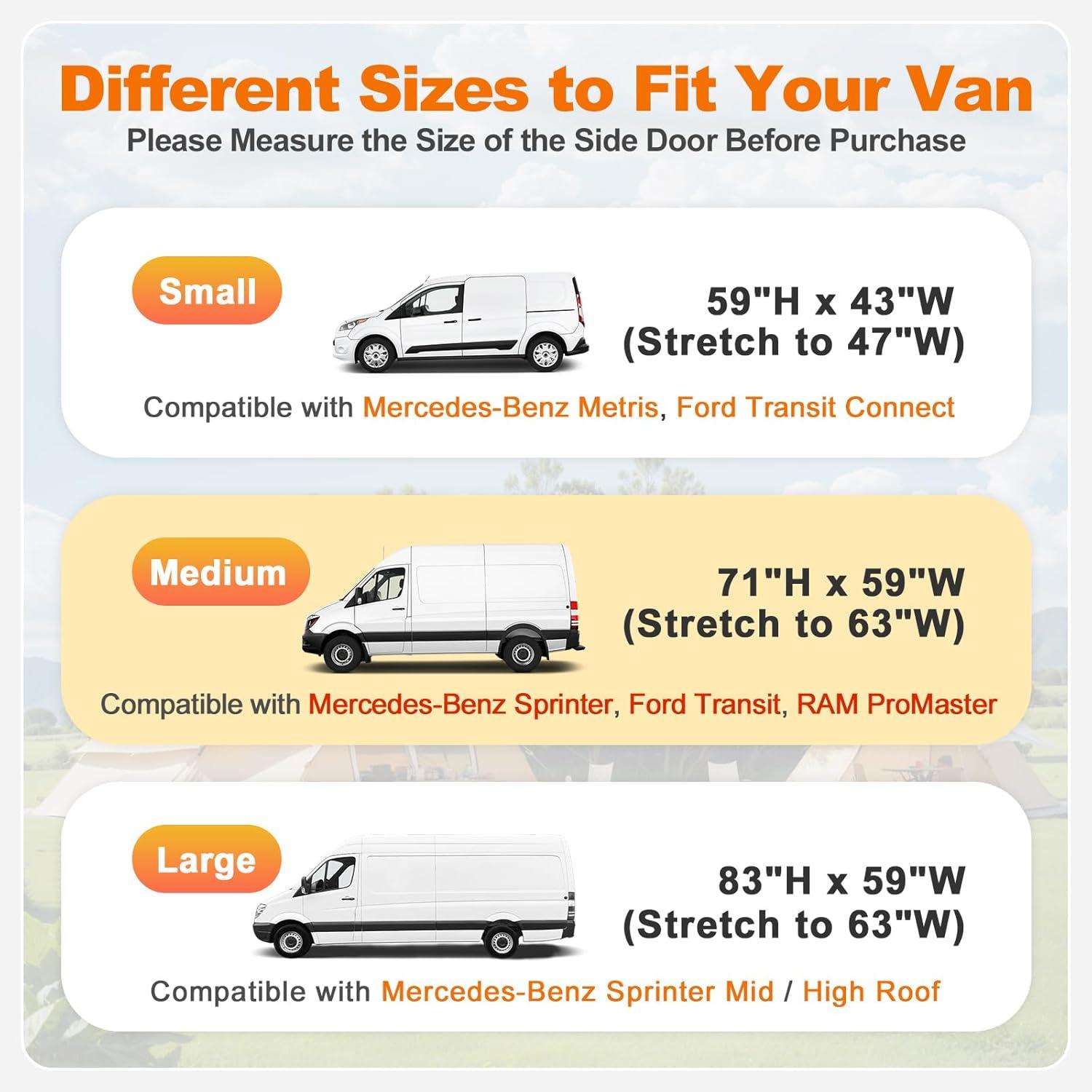 Magnetic Van Bug Screen Size: The size of this magnetic fly screen door is 59″H x 43″W, its size is compatible with Mercedes-Benz Metris, Ford Transit Connect, Campervan side door. Please measure the size of the side door before purchase