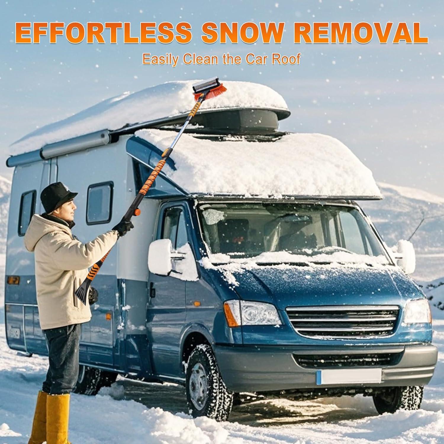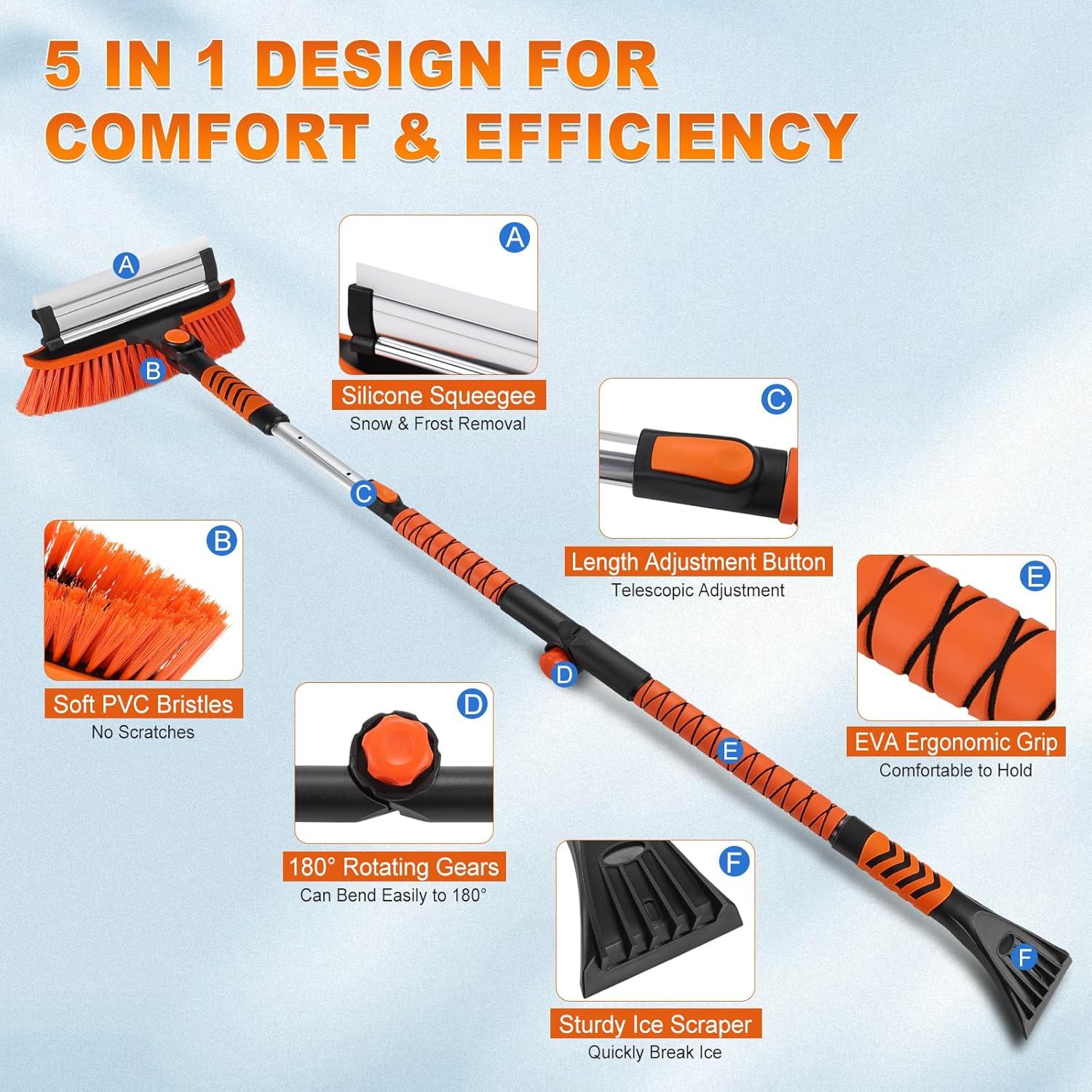 Multi-Purpose Snow Brush Design: Our collapsible extension snow brush features multiple functions including a snow brush, ice squeegee and ice scraper. The soft snow brush and silicone scraper on top quickly remove snow and frost from your car's windshield and windows without causing scratches. The ice scraper at the end can be used for frost and ice, ensuring your vehicle is winter-ready at all time