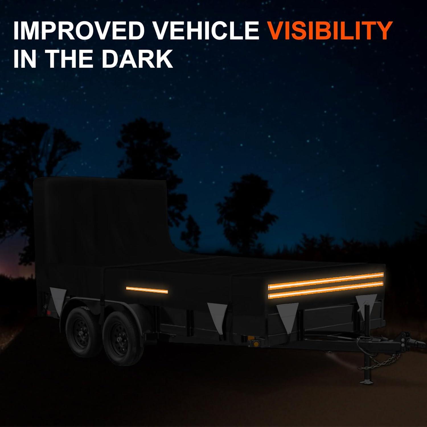 Enhanced Nighttime Safety: The design of the utility trailer cover with color-impacting reflective strips, which enhances the visibility of the trailer in low-light environments, and rear for safety avoid collision during night. Provide improved safety at night or when parking