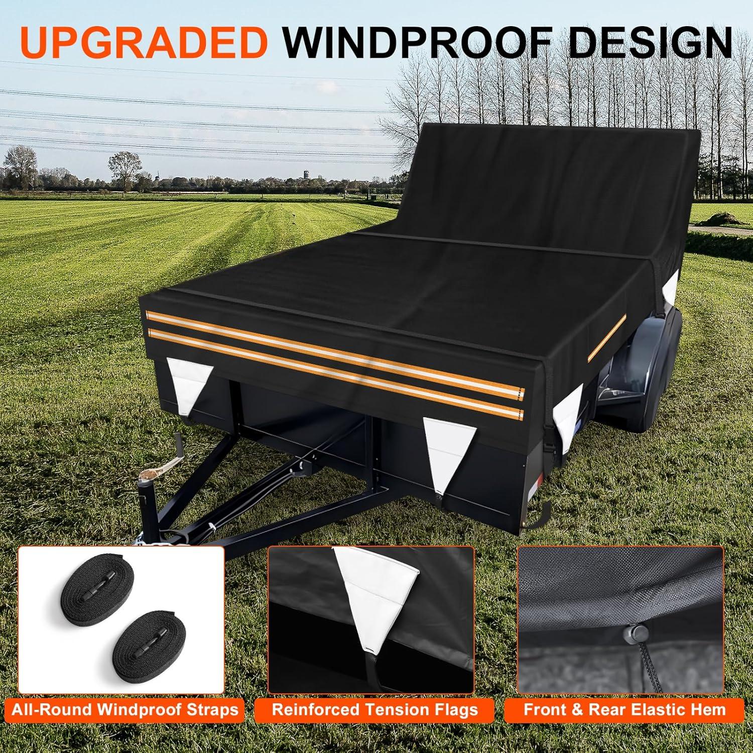 Windproof & Tear Resistant: Utility trailer cover comes with 4 windproof straps and 2 extra-long all-round straps to ensure overall stability and improve windproofing. These sturdy fastenings, along with elasticized hem corners provide a secure and custom fit. This ensures your cover stays in place, even in strong winds and prevent tearing in the wind