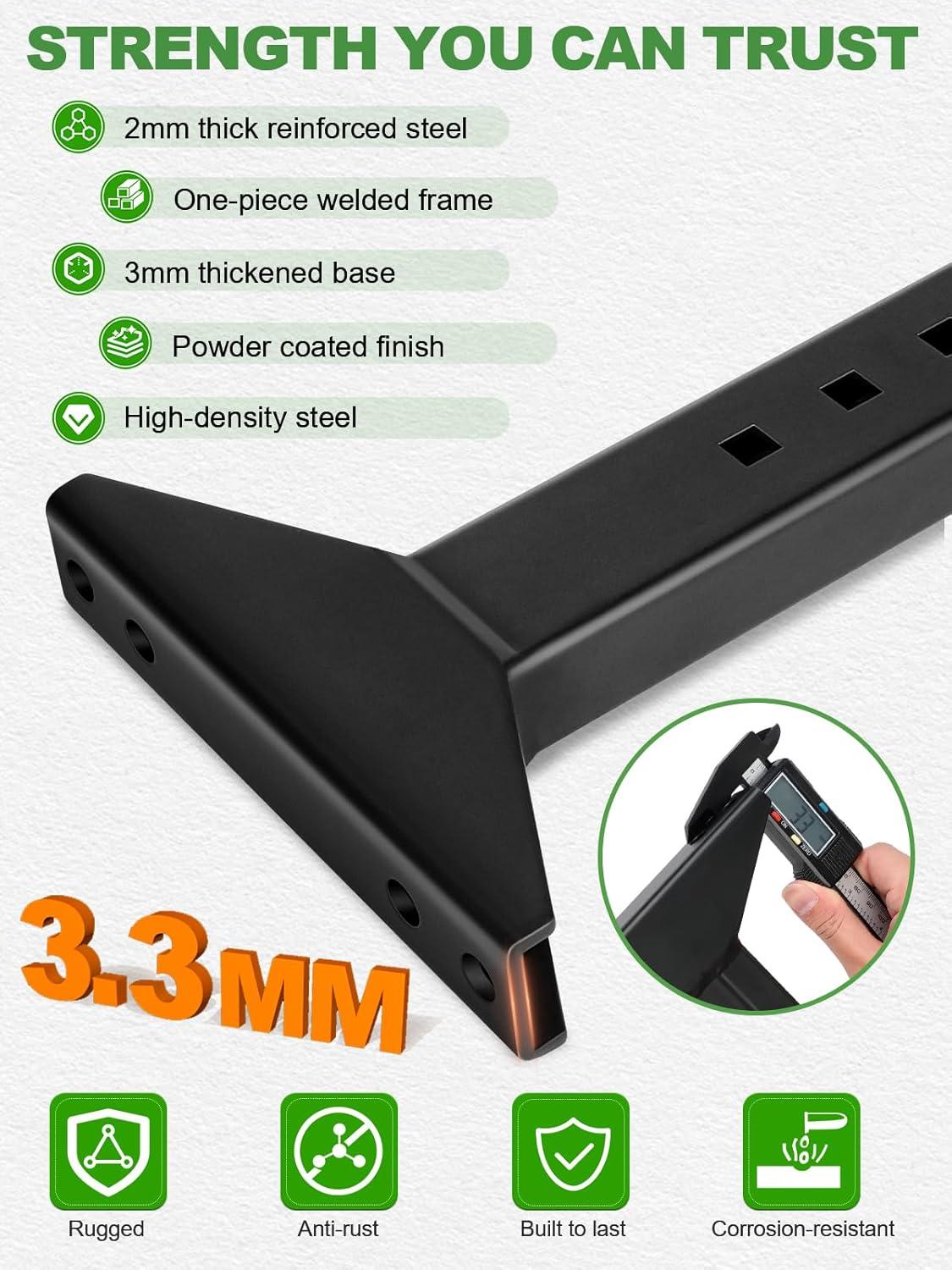 Heavy-Duty Steel Frame: Built tough for demanding use, this rack features a one-piece steel structure made of thick metal, reinforced with a 3mm base. It supports significant weight—strong enough to hold an adult without bending. Corrosion-resistant and wear-proof, it stands up to outdoor conditions with minimal maintenance