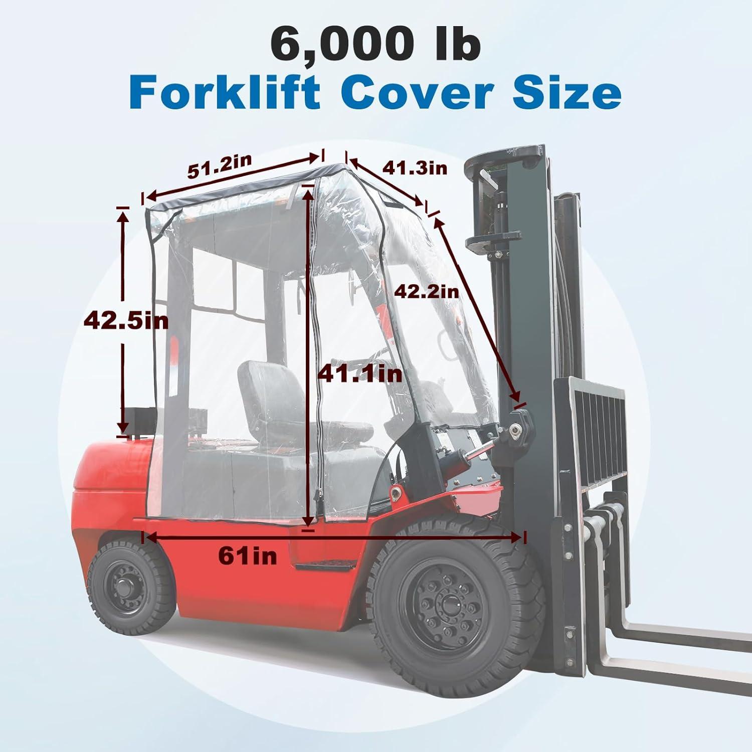 Universal Fit:The SKYJDM clear forklift cover measures 61″ L(Top 51.2″) x 41.3″ W x 51.2″ H, fitting various forklift models capacity up to 6000 lbs. Its extensive coverage meets most users' needs, ensuring smooth operations and optimal protection for your equipment