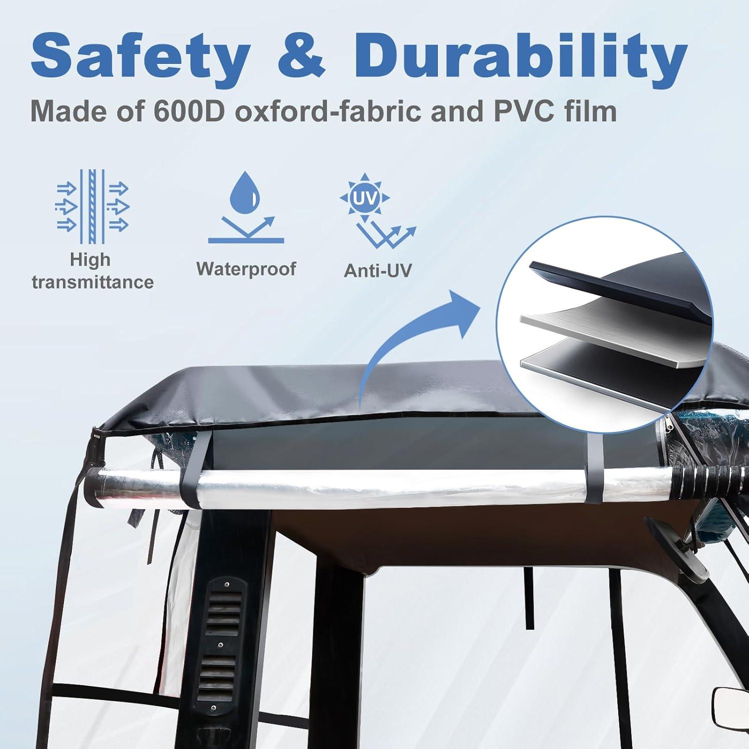 Adjustable Roll-Up Design: The forklift cab cover features a flexible roll-up design with adjustable drawstrings, allowing you to easily customize the fit for different weather conditions. Roll it up for ventilation during hot summer days or roll it down for warmth in colder months. Zippers on both sides ensure convenient access for personnel