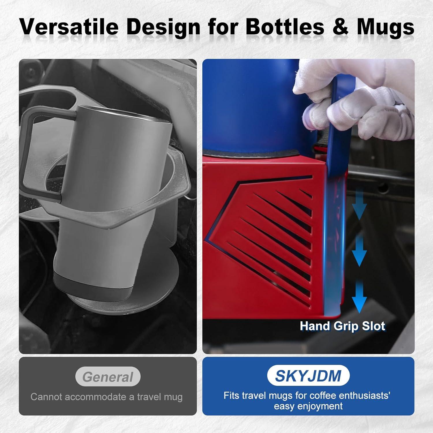 Wide Compatibility: The special design of this cup holder accommodates both handle-less cups like glasses and bottles, as well as mugs with handles. Featuring a 3.5-inch hole diameter, it fits a wide range of 18-40 oz cups. The added hand grip slot makes it even more convenient, allowing for easy handling. Whether you prefer cold drinks or hot coffee, this cup holder meets all your needs
