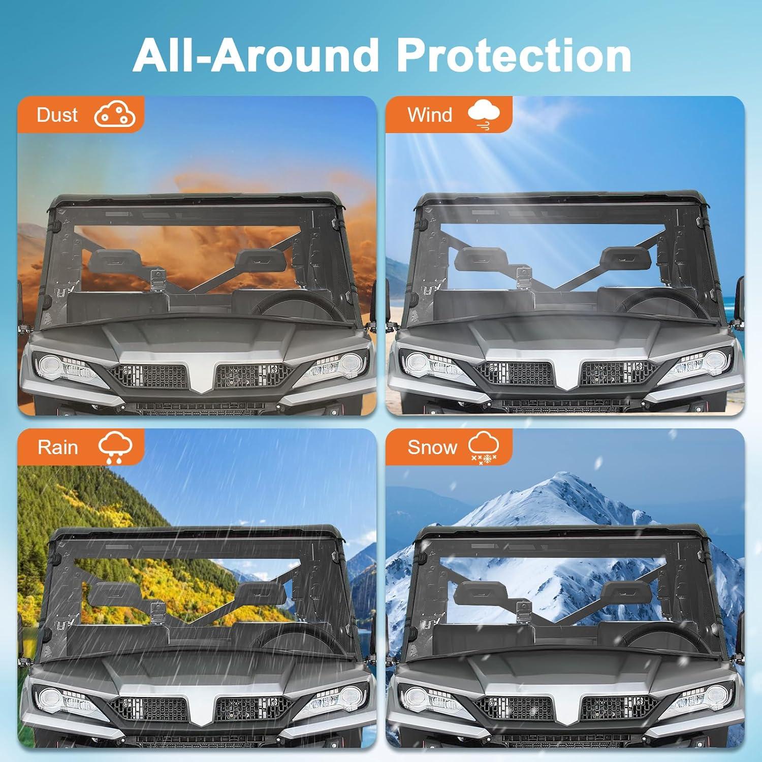 Enhanced Safety Shield: The front windshield offers extra protection against rocks, branches, and other debris on the trail. Its sturdy and impact-resistant construction reduces the impact of outdoor elements