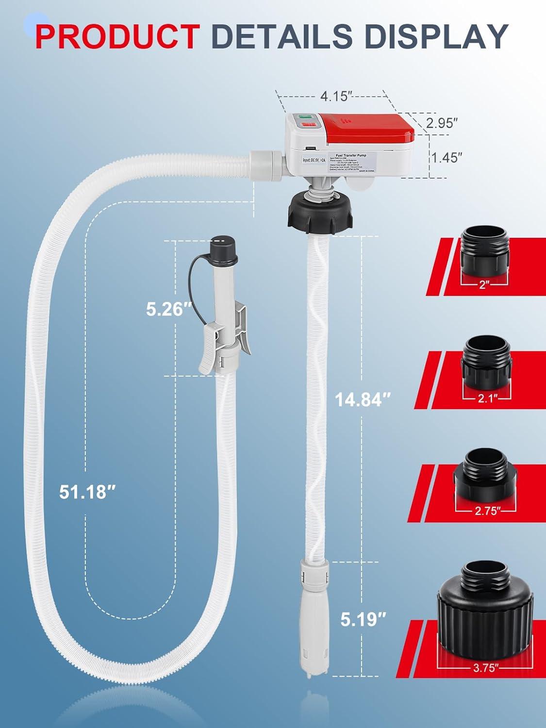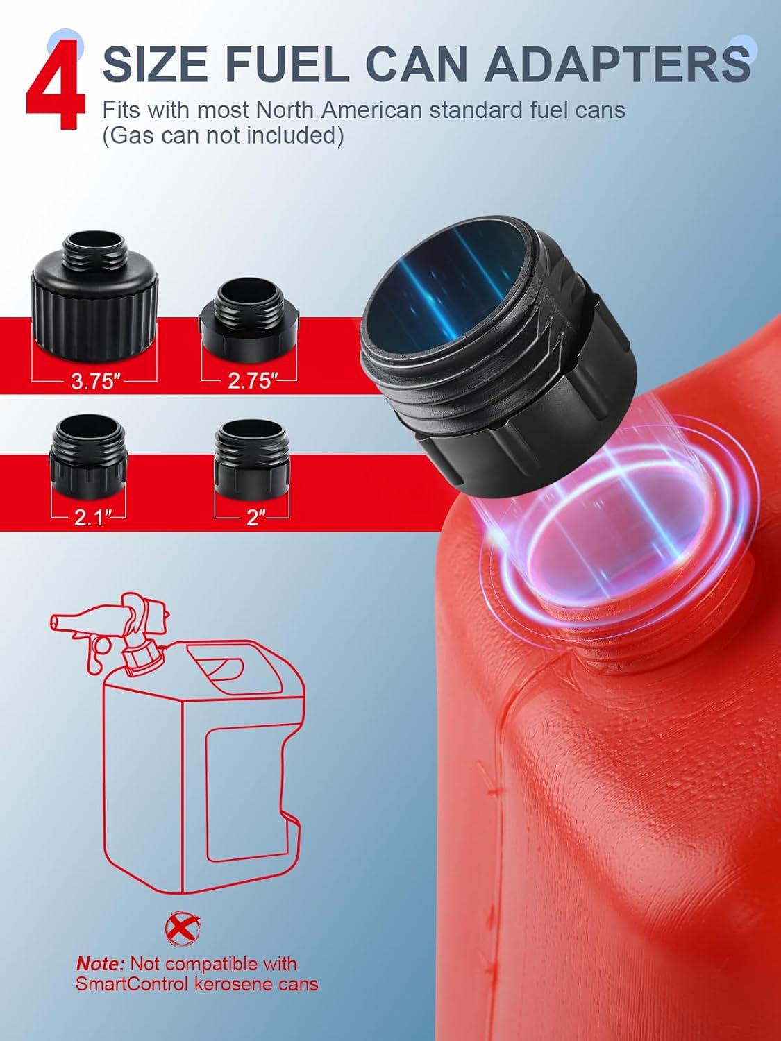 Universal Fit: 4 adapter sizes (2.0″, 2.1″, 2.75″, 3.75″) fit most North American fuel cans. The included 51″ hose easily reaches the bottom of most fuel tanks. Suitable for cars, motorcycles, UTVs, RVs, or other equipment
