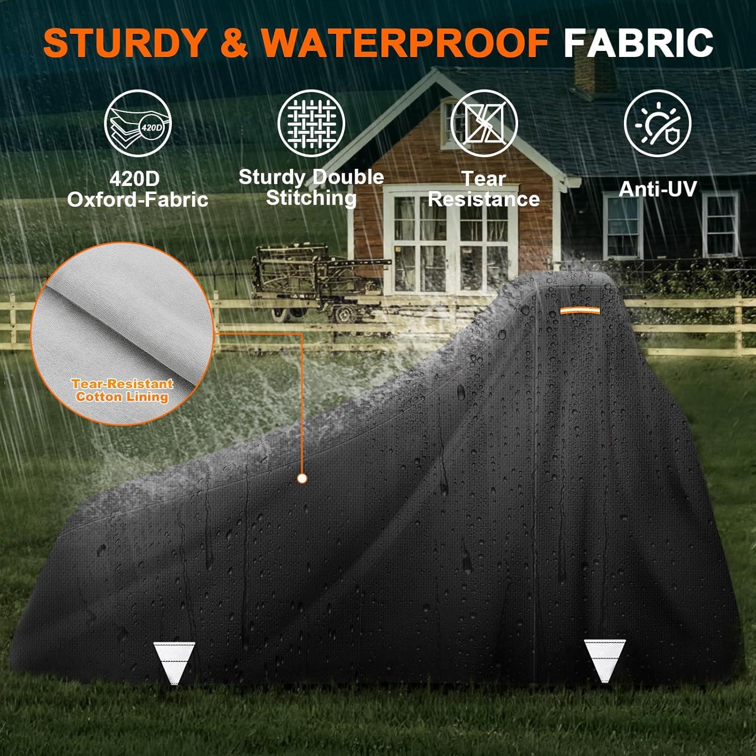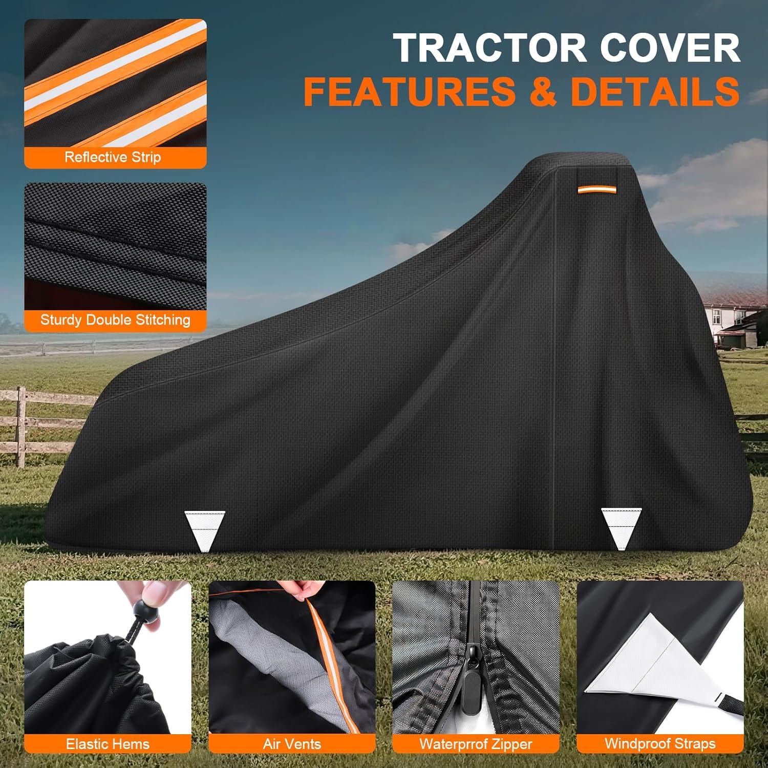 Sturdy & Hard-Wearing Material: The tractor cover is made of waterproof 420D oxford-fabric, which provides long-lasting durability and tear resistance. It protects your tractor from rain, snow, UV, dust, wind, and scratches, and is built to withstand harsh weather conditions, preserving the appearance and lifespan of your tractor