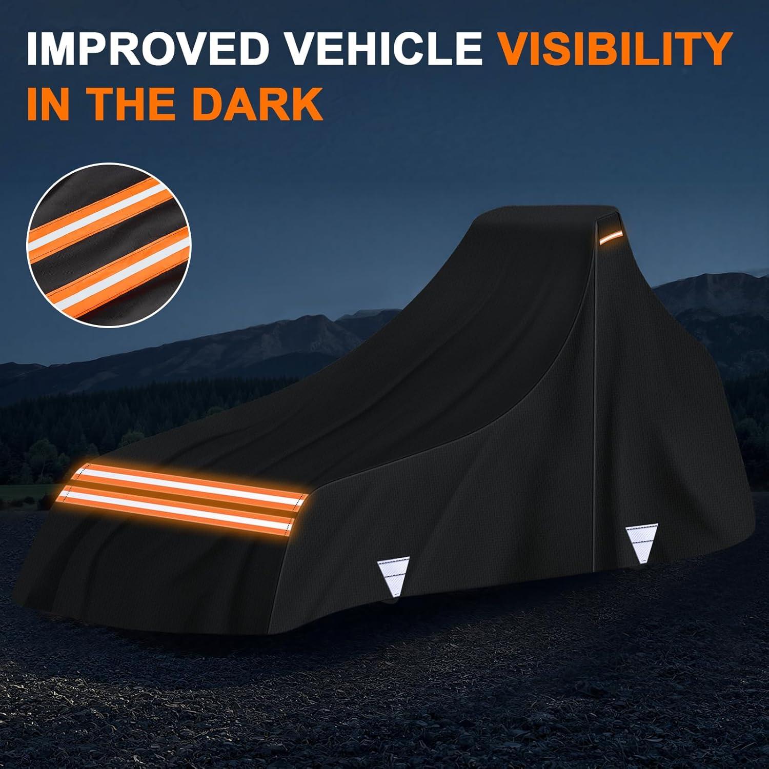 All-Weather Protection: Our tractor cover offers comprehensive all-weather protection, keeping your tractor free from UV rays, rain, snow, and falling leaves. It also comes with reflective strips that enhance the visibility of the trailer in low-light environments, providing improved safety at night or when parking