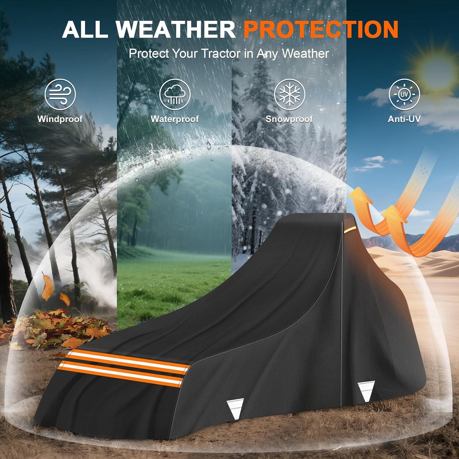 Easy to Install: The tractor cover can be installed quickly and easily without any tools.Its adjustable windproof buckle and elastic hem corners ensure a secure and customized fit. This keeps the cover in place even during strong winds, preventing it from tearing