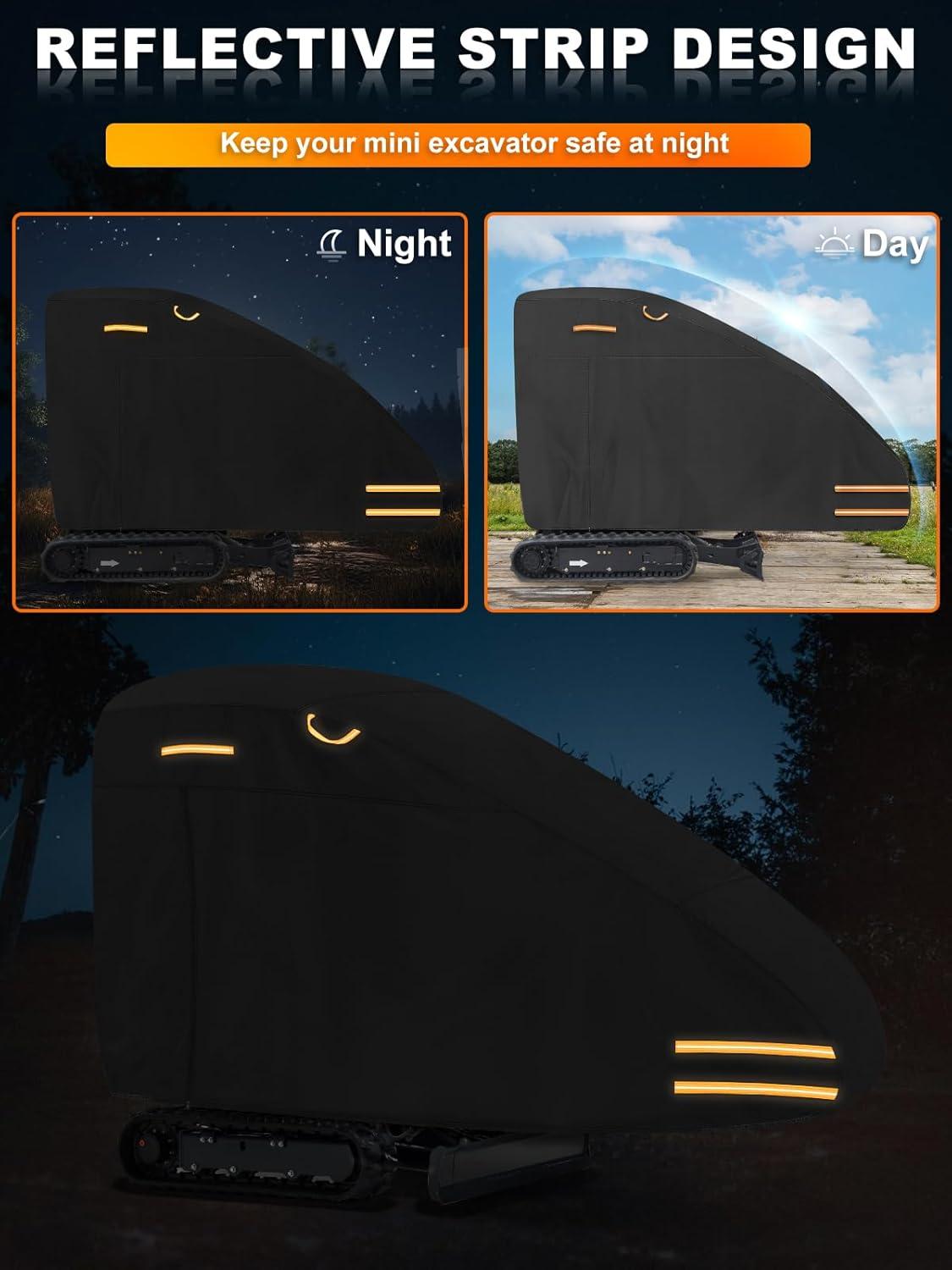 Wind Resistance & Safety: Equipped with an elastic hem and reinforced straps at the bottom, the excavator cover remains secure in strong winds. The tightly stitched seams ensure stability, while reflective strips improve visibility in low-light conditions, reducing accidents and enhancing safety on-site. Easy to install without tools, it offers reliable protection in minutes