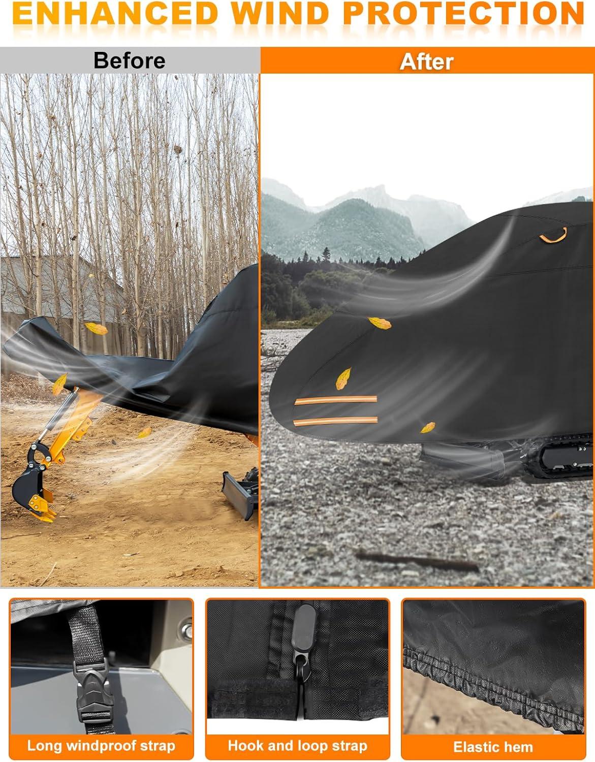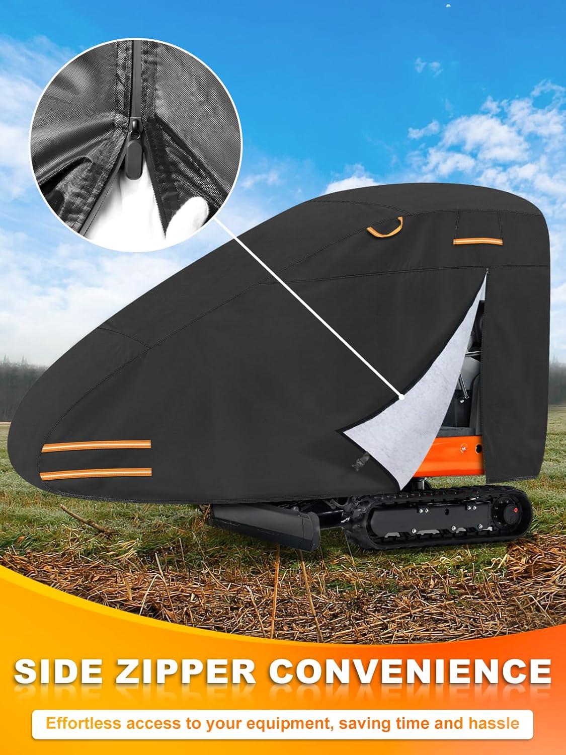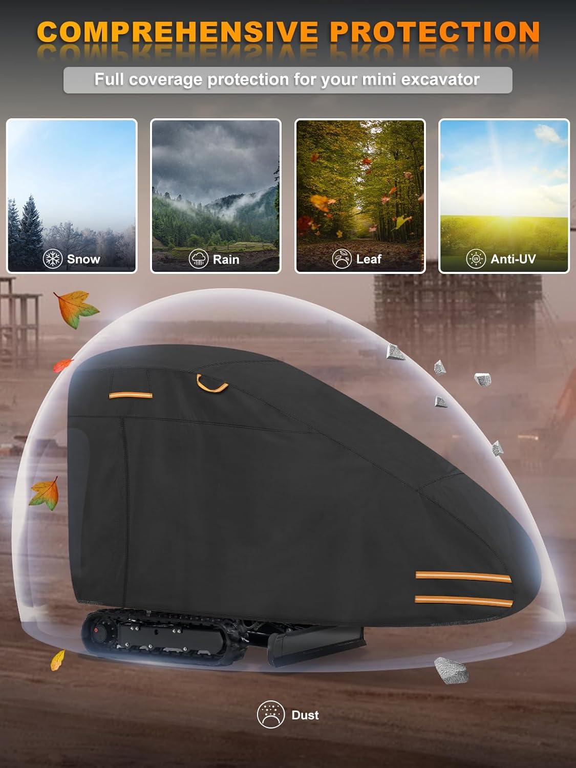 Upgraded Waterproof: The excavator cover crafted with high-density nylon fabric for exceptional tear resistance and waterproofing, it effectively blocks water penetration during rainy conditions. The waterproof zipper, combined with a hook-and-loop closure at the base, enhances sealing to keep out rain and dust, ensuring your equipment stays clean and dry