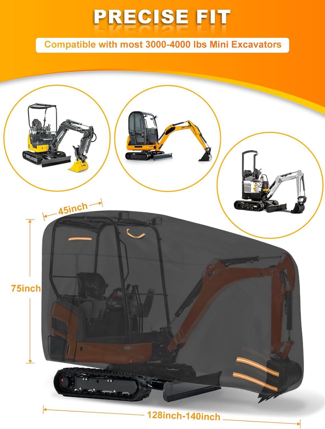 Full Coverage Protection: This mini excavator cover is compatible with Kubota U17 / Kubota KX018-4 / Bobcat E17 / Bobcat E19 / Bobcat E20 / Caterpillar 301.7 CR / Caterpillar 302 CR / John Deere 17G / Yanmar VIO20 / Yanmar SV20 / Takeuchi TB216 / Takeuchi TB219 / JCB 18Z-1 / JCB 19C-1 for 3000-4000 lbs excavators. It provides a precise fit and comprehensive protection, reducing damage caused by sun exposure, harsh weather, and environmental factors. It extends the equipment’s lifespan and lowers maintenance costs