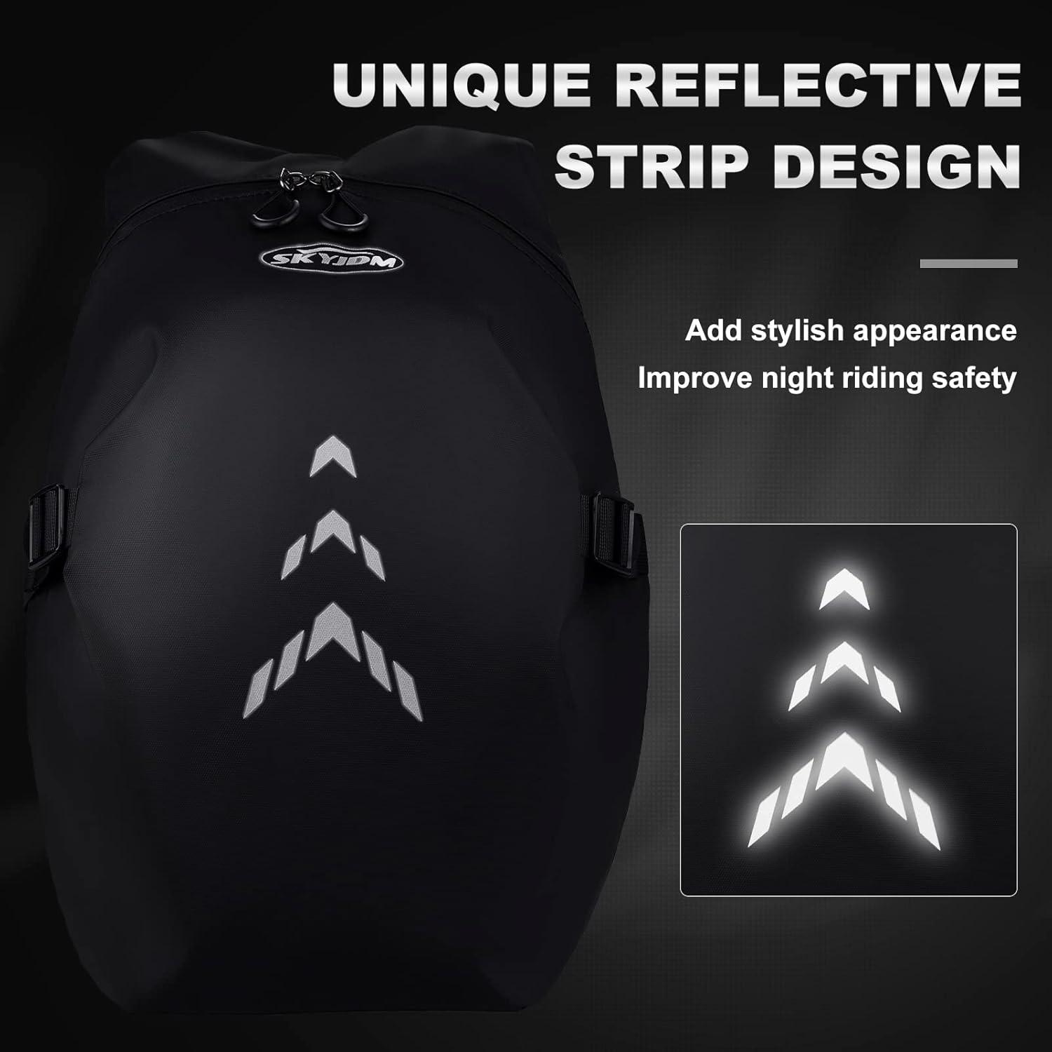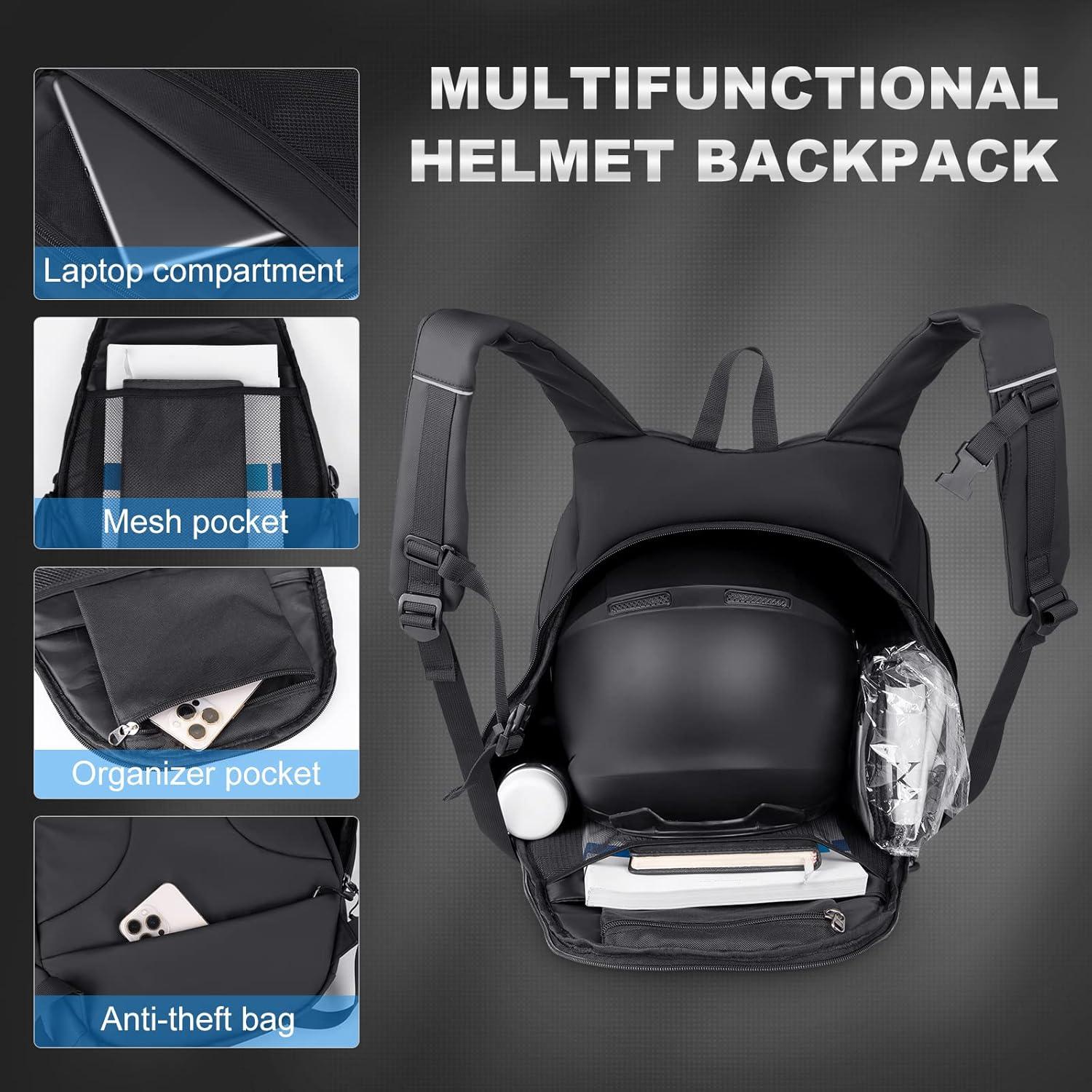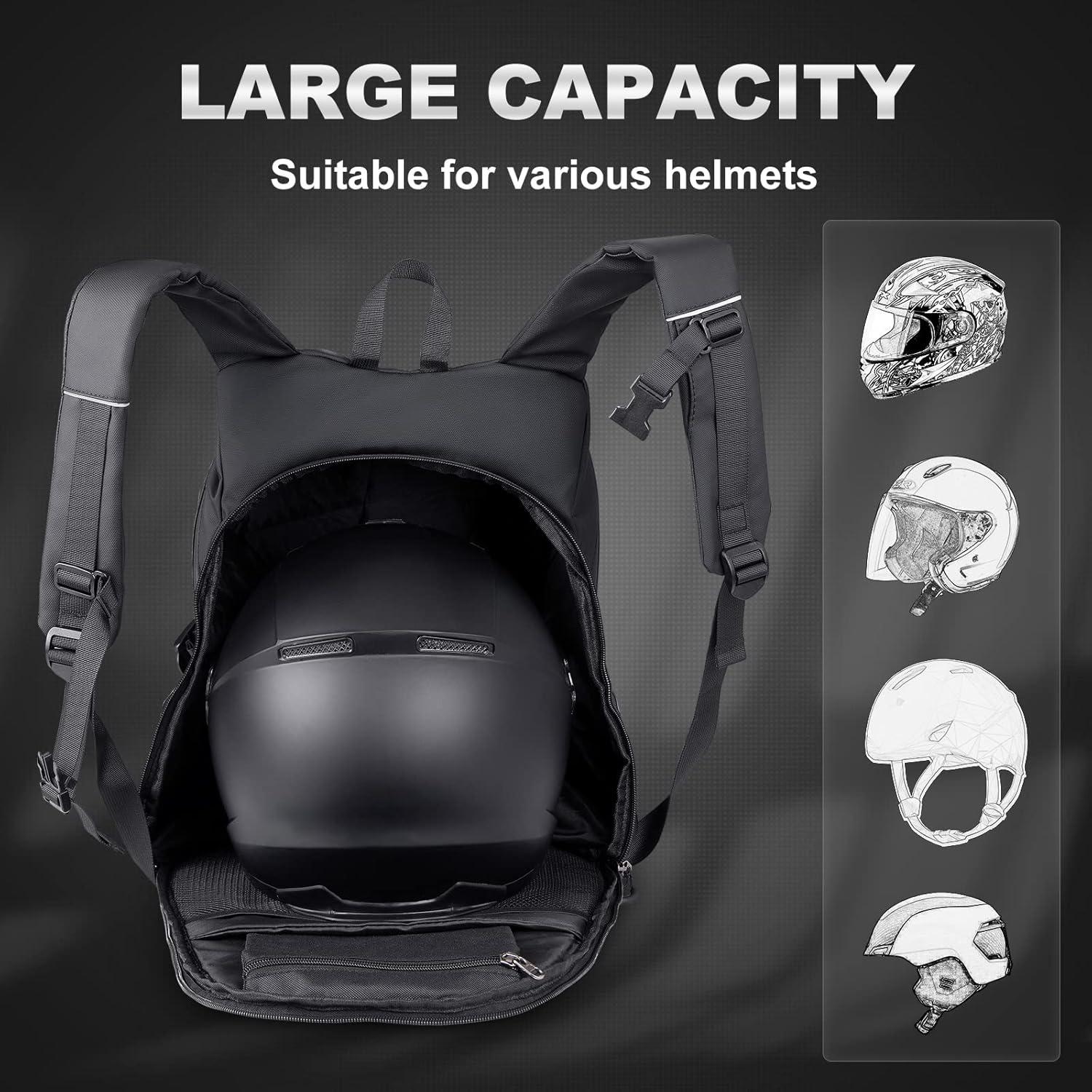 Double Openings & Large Capacity: The motorcycle helmet backpack can easily storage more than 99% of motorcycle helmets (Full-face helmets, rally helmet, flip up helmet), gloves, protective gear and other cycling equipment, and can be loaded with laptop