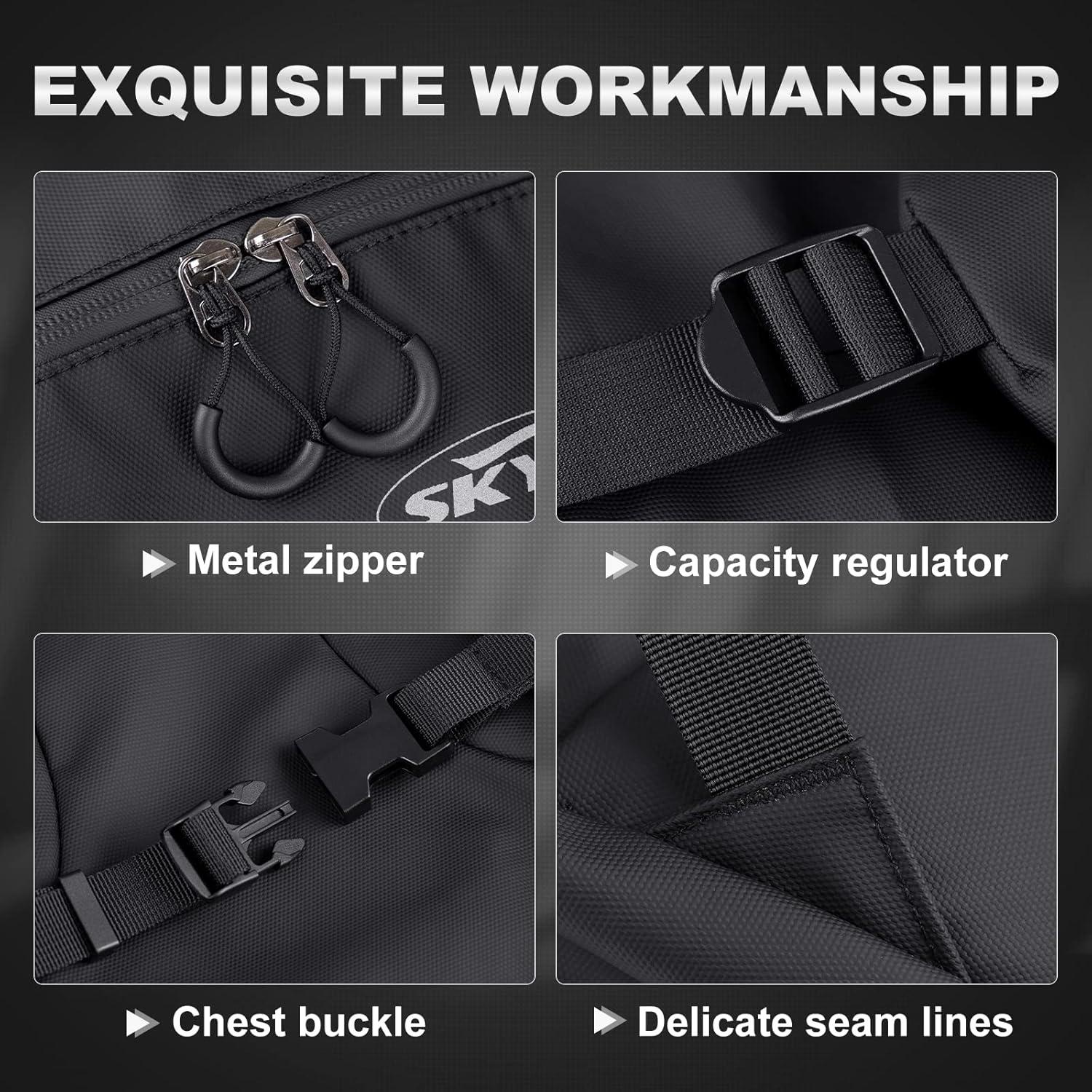 Waterproof Fabrics & Tear Resistance Design: Made of 800D polyester and utilizes thickened leather membrane to improve the waterproof & sturdy performance of the motorcycle backpack, zippers and seams are also designed to be waterproof