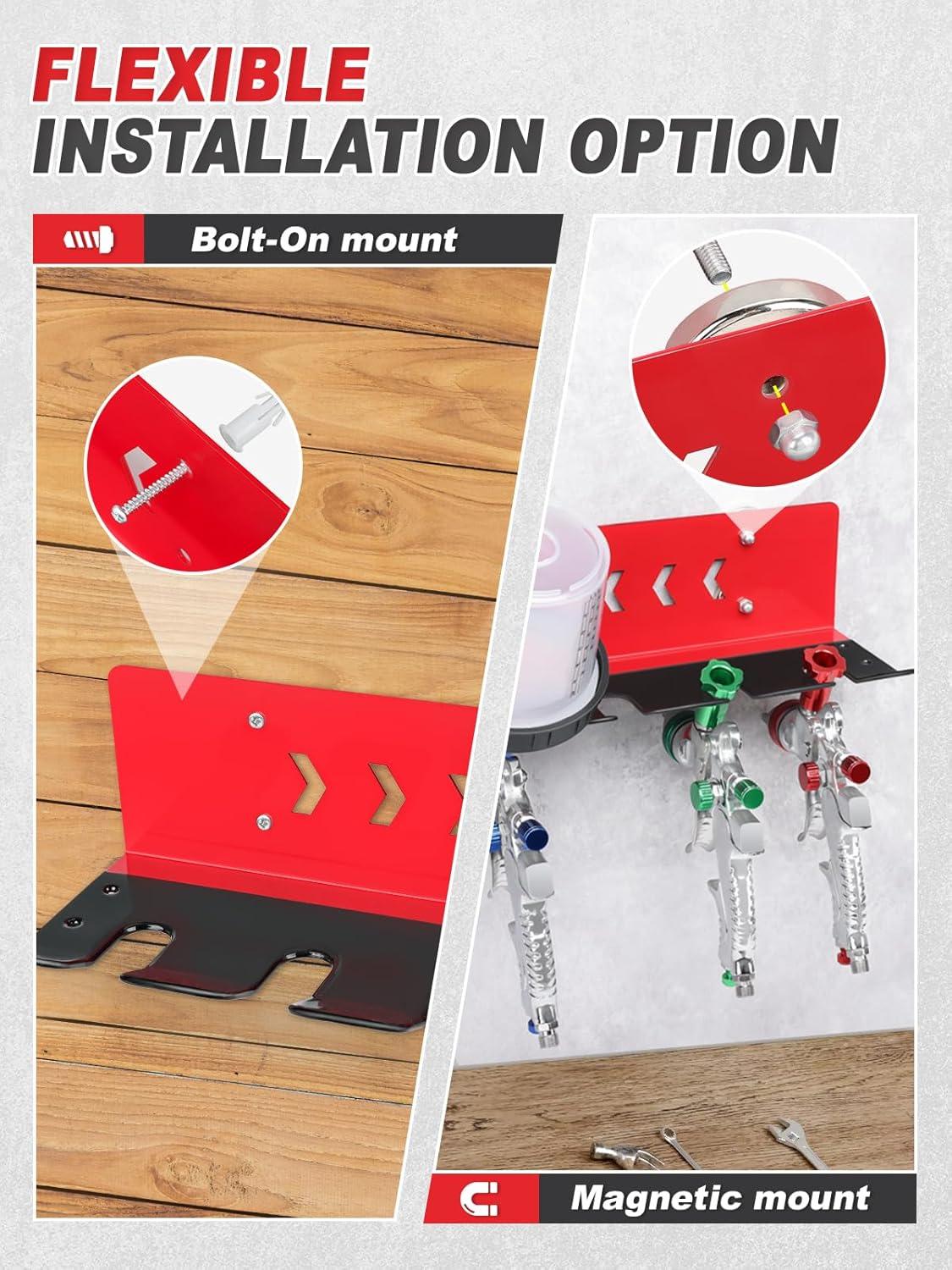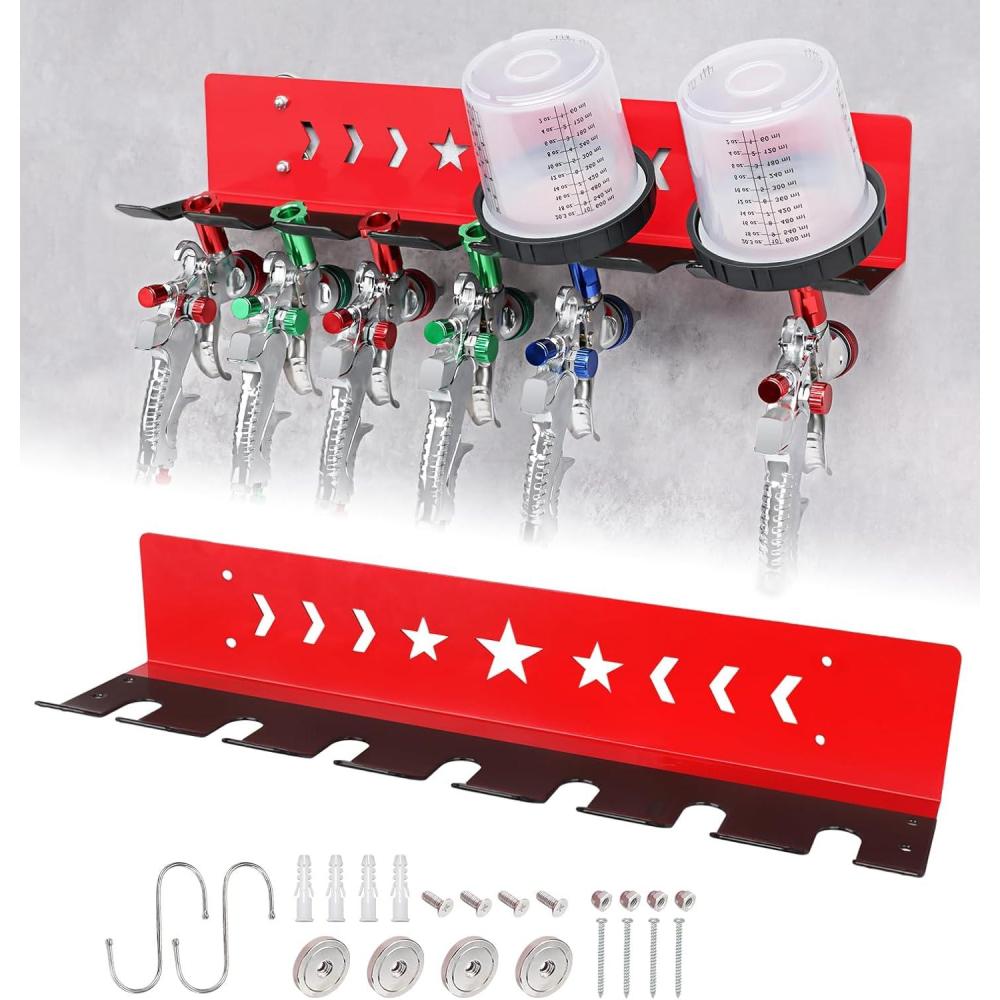 Paint Spray Gun Rack for Magnetic or Wall Mount, Holds 7 Gravity Feed Guns or 4 with Cups, Heavy-Duty Steel Paint Organizer with S-Hooks for Garage, Body Shop or Workshop, Red(red)