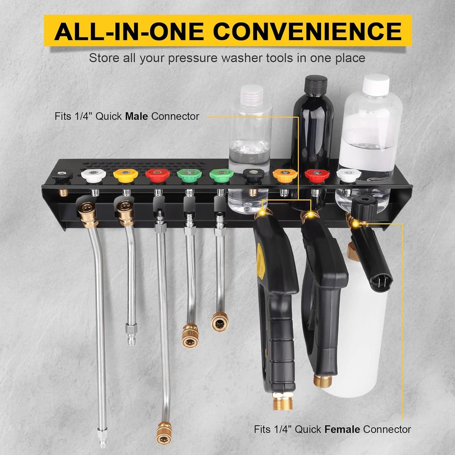 Pressure Washer Gun & Foam Cannon Holder with 1/4 Inch Quick Connector, Wall-Mounted Nozzle Tip & Extension Wand Organizer for Pressure Washer Parts & Accessories