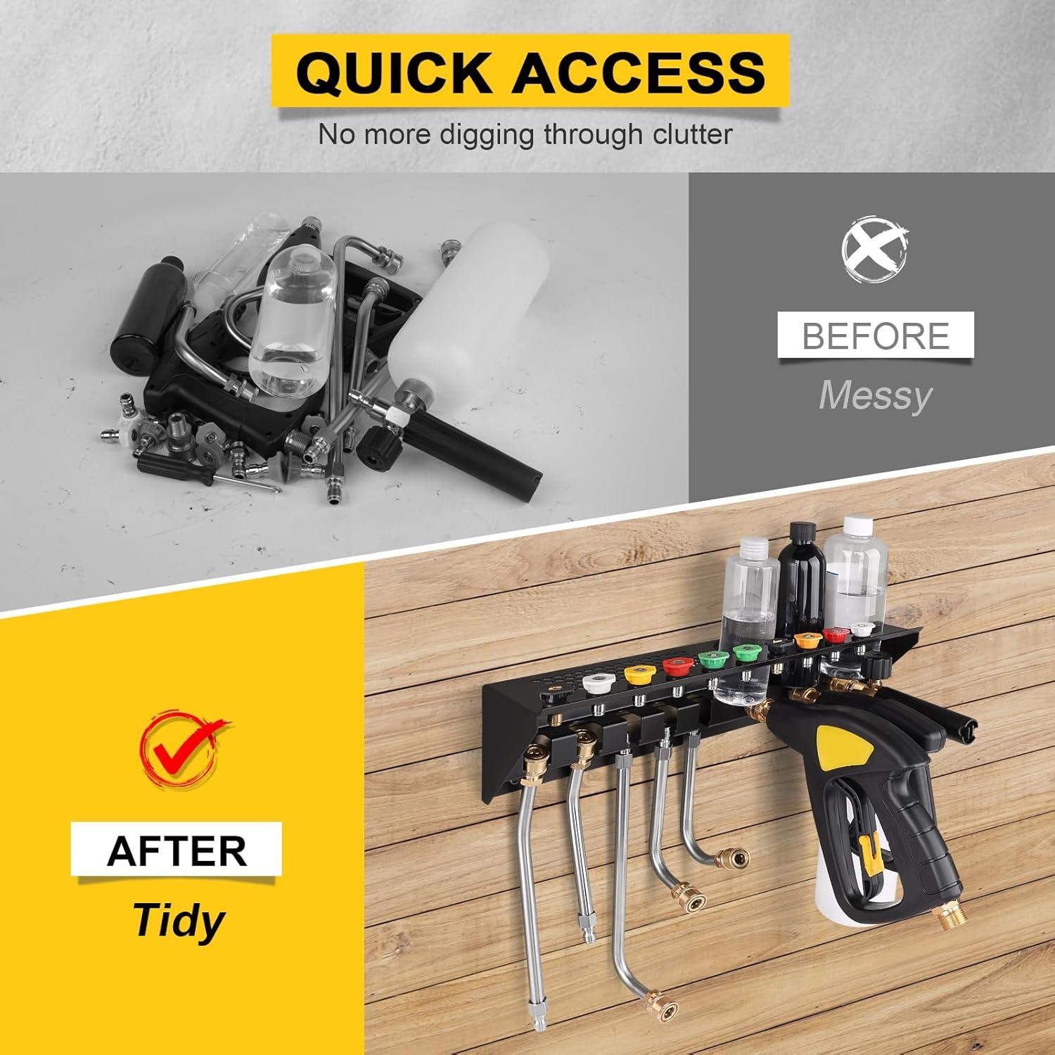 All-in-One Convenience: Why juggle multiple tools when you can store your pressure washer gun, foam cannon, extension wand, and nozzles all in one sleek holder? Declutter your workspace instantly, keep everything within arm's reach with our pressure washer gun holder, and never waste time searching for your tools again