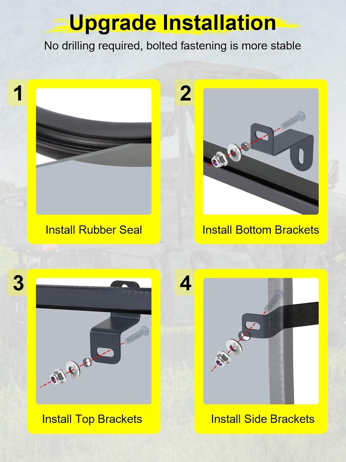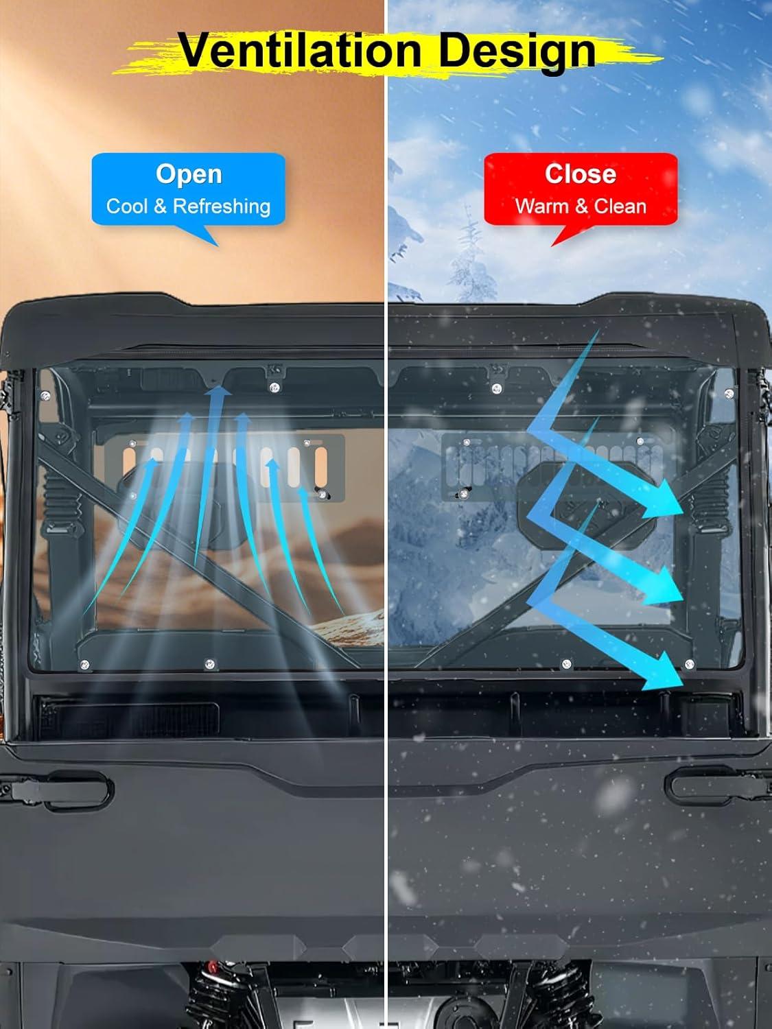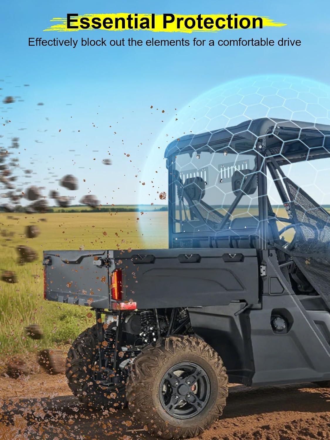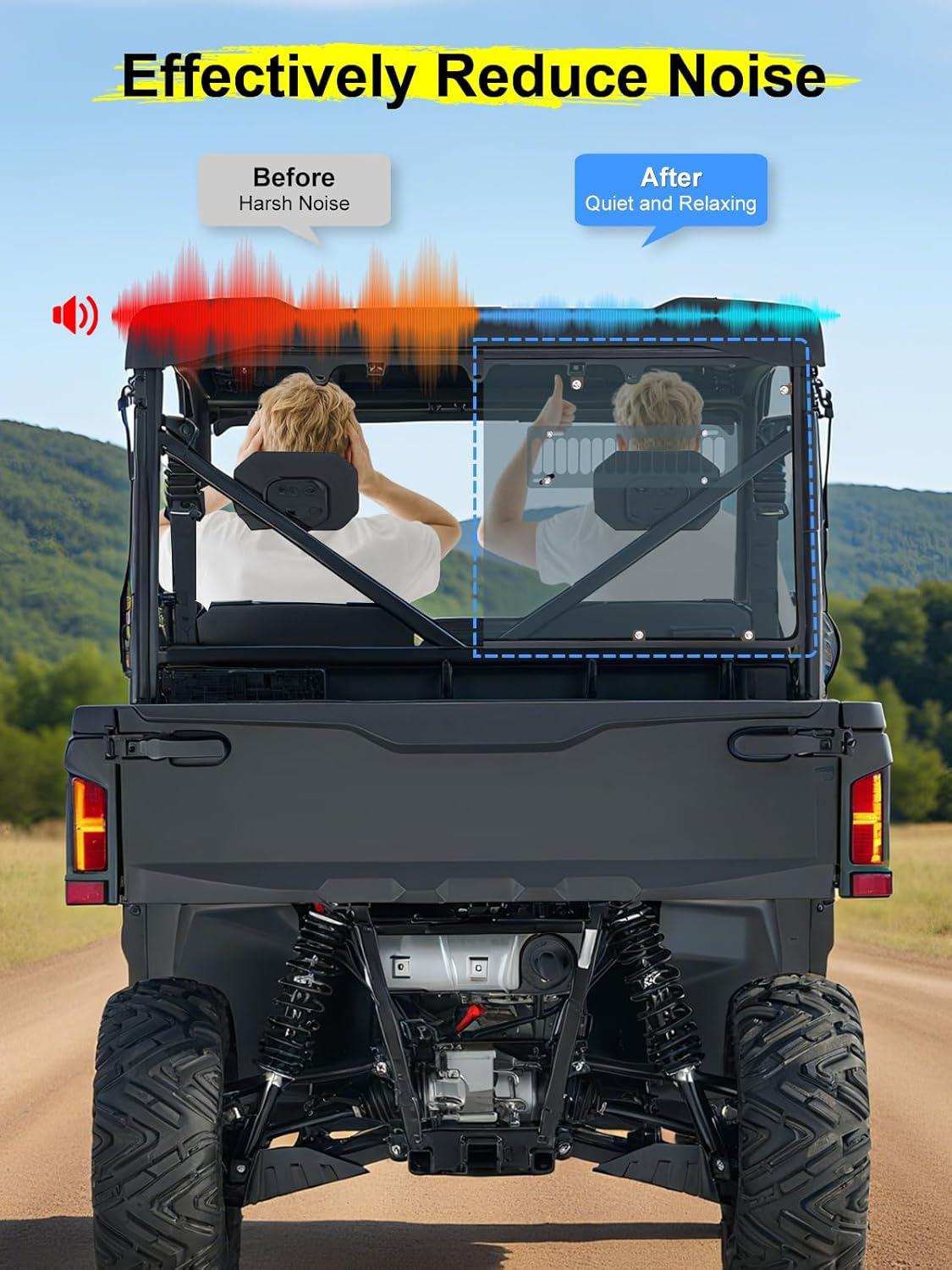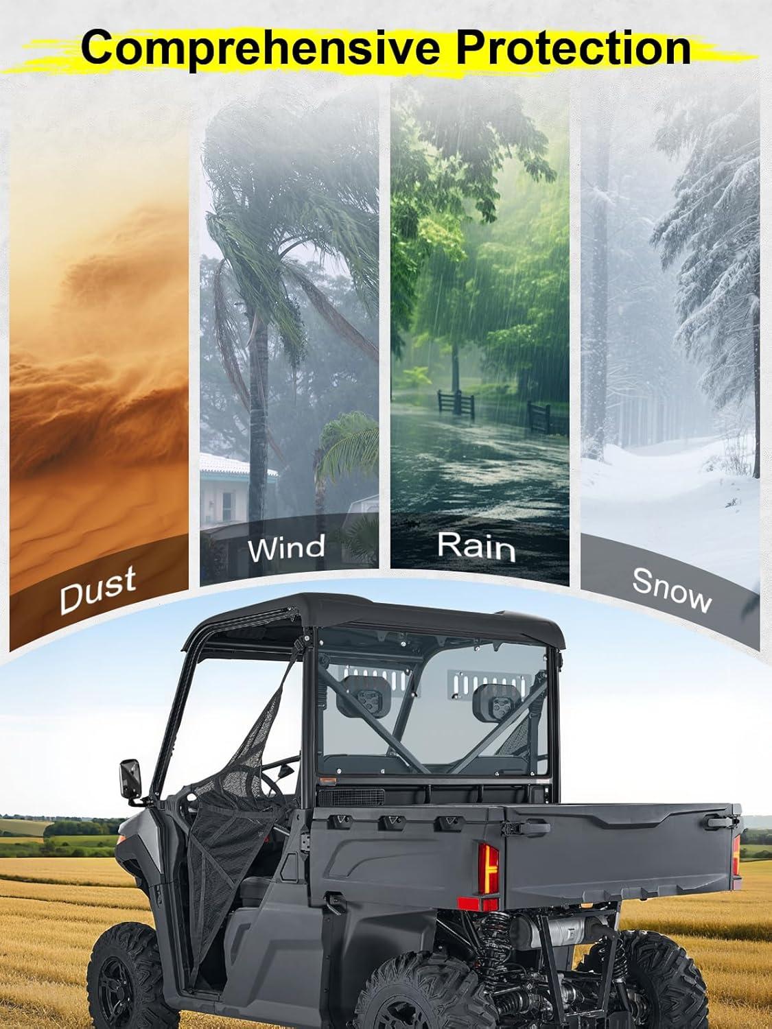 Comprehensive Protection: Offers reliable UV protection while shielding your UTV from rain, snow, leaves, and dust. The full windshield keeps your cabin clean and safe, while the noise-reducing rubber seal reduces vibrations and squeaks for a quieter, smoother ride