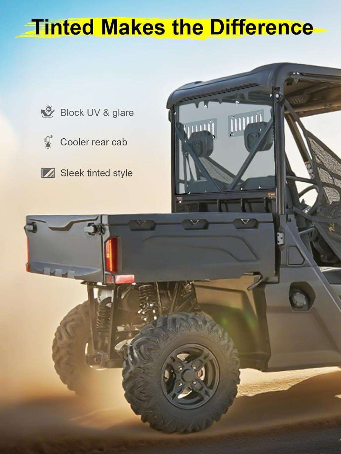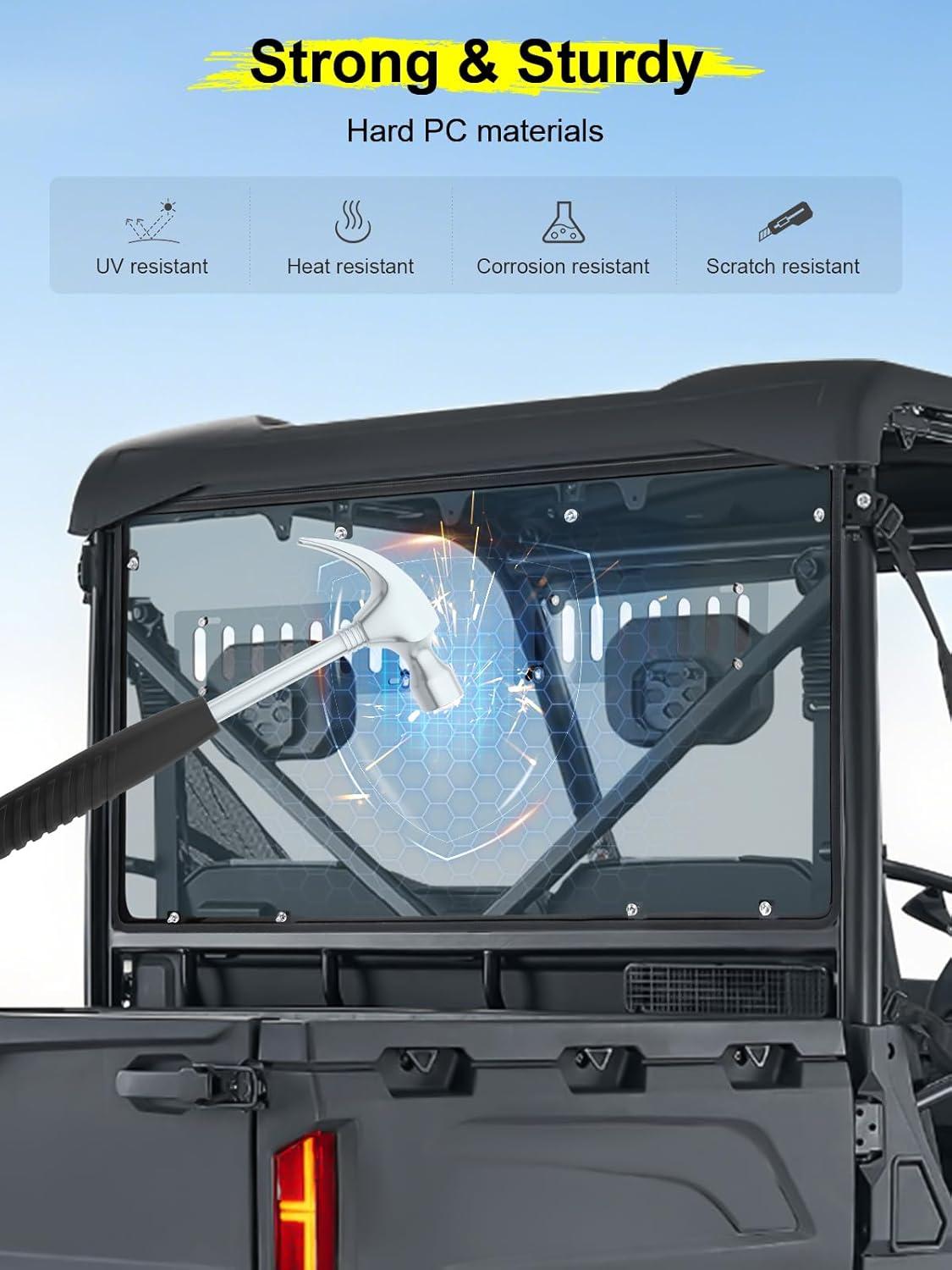 Clear & Scratch-Resistant: This back window is made from premium harded polycarbonate (PC) with a light transmittance of over 95%, offering unmatched clarity for a wide-open view of the road ahead. The material is 250 times stronger than glass and 25 times tougher than acrylic, with a scratch-resistant coating to withstand rugged environments and protect against flying debris