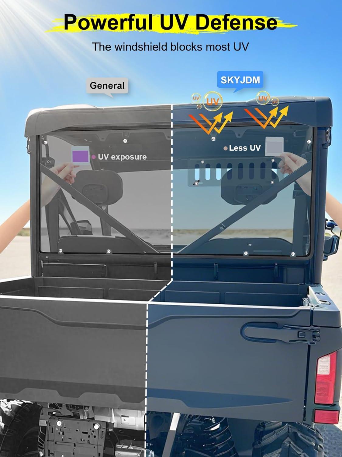 Compatibility: SKYJDM rear windshield is compatible with CFMOTO UFORCE 600 2021-2025, this windshield is designed to fit your UTV, requiring no modifications. It ensures a secure and stable fit, blending seamlessly with your vehicle for enhanced aesthetics and dependable protection
