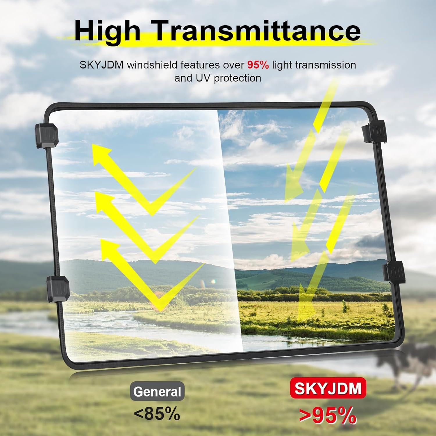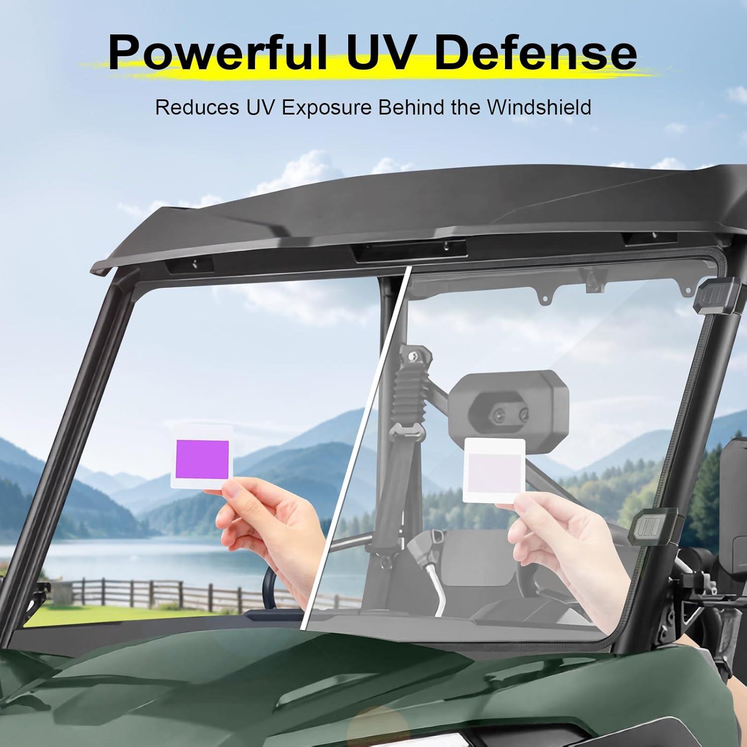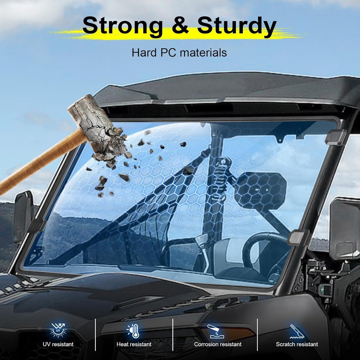 Clear & Scratch-Resistant: This clear front window is made from premium harded polycarbonate (PC) with a light transmittance of over 95%, offering unmatched clarity for a wide-open view of the road ahead. The material is 250 times stronger than glass and 25 times tougher than acrylic, with a scratch-resistant coating to withstand rugged environments and protect against flying debris