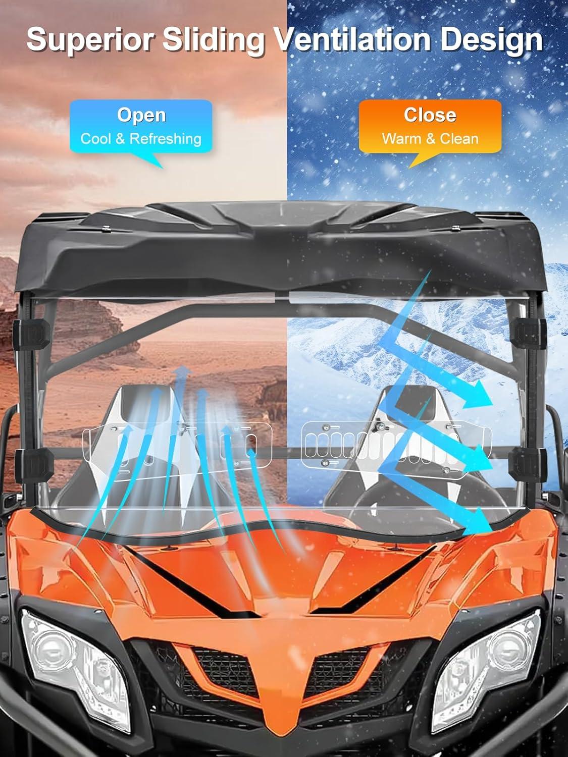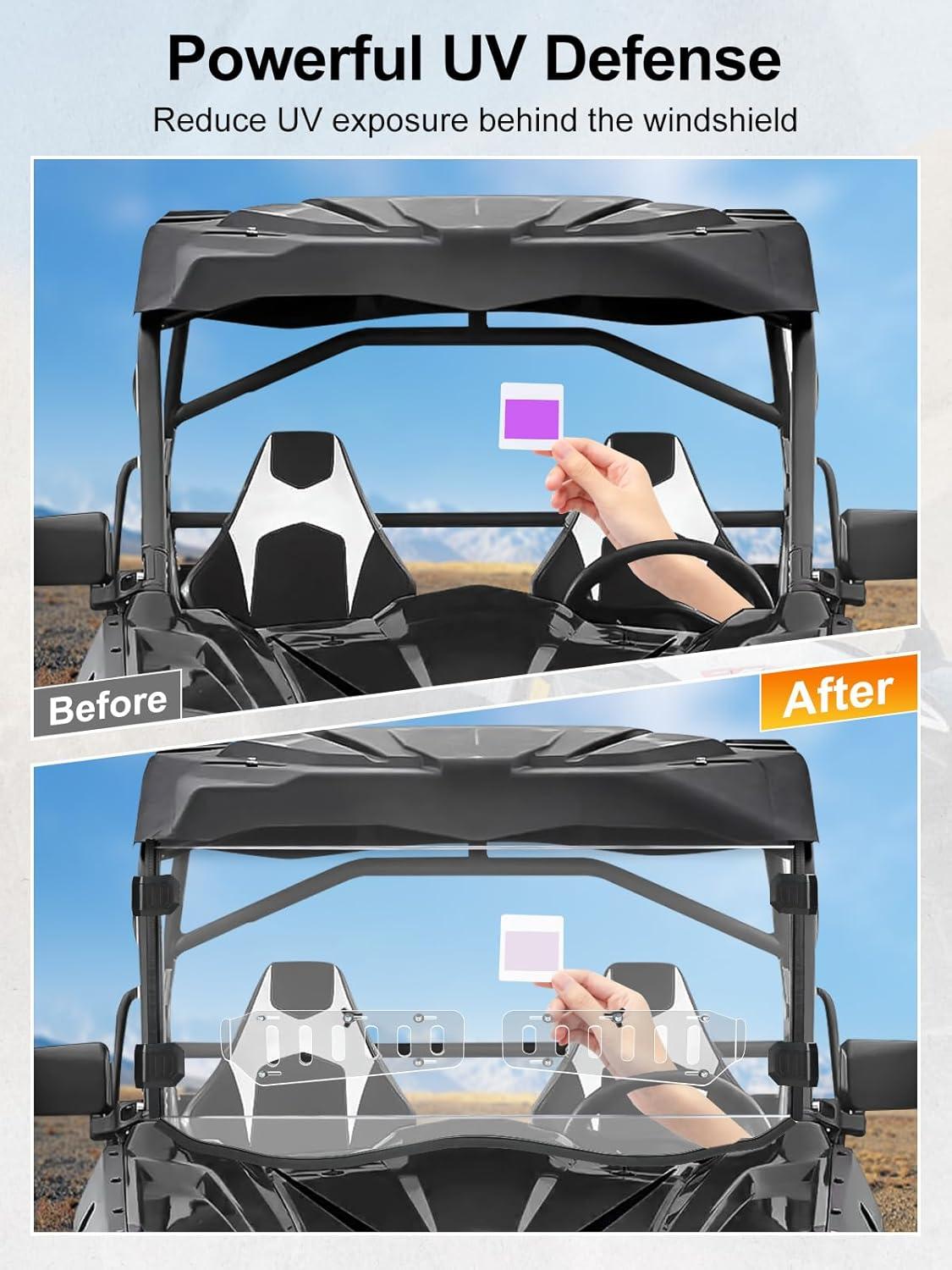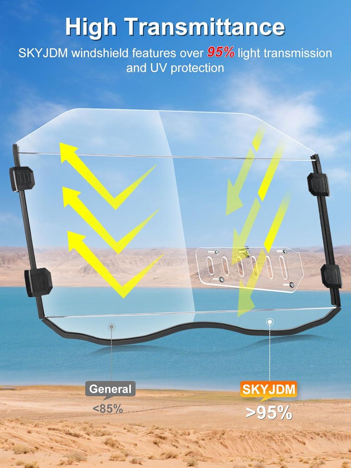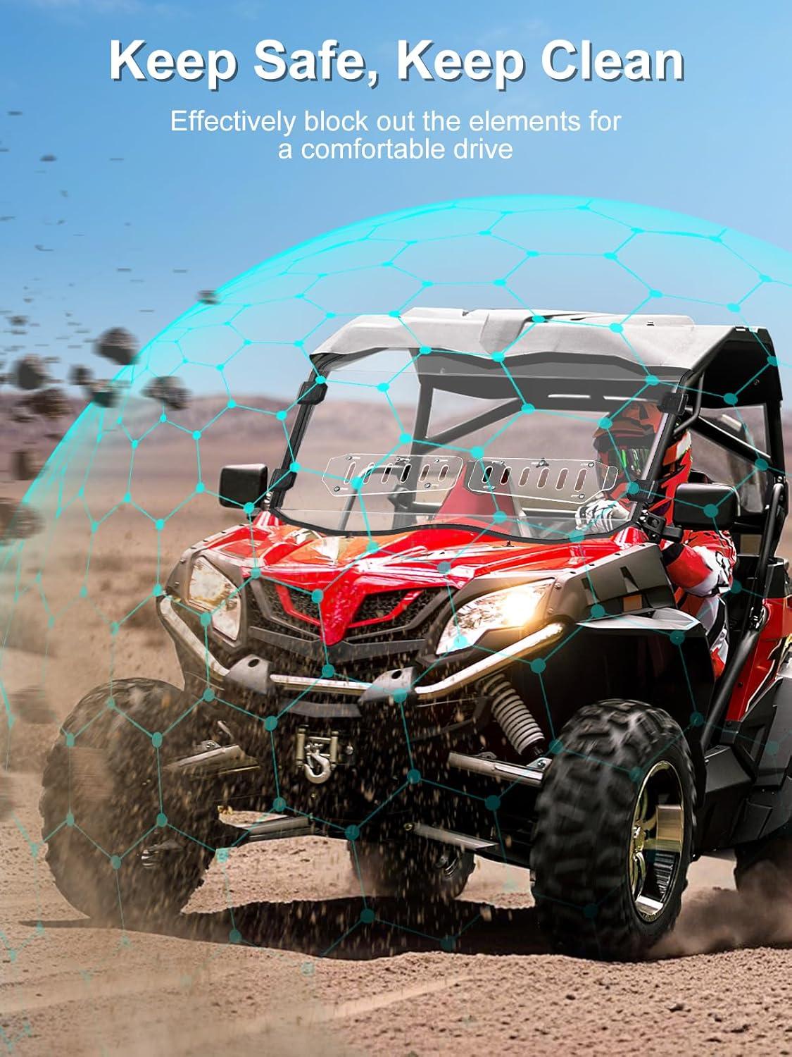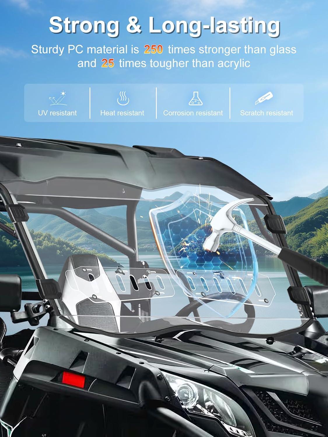 Clear & Scratch-Resistant: This front window is made of premium harded polycarbonate (PC) with a light transmittance of over 95%, offering unmatched clarity for a wide-open view of the road ahead. The material is 250 times stronger than glass and 25 times tougher than acrylic, with a scratch-resistant coating to withstand rugged environments and protect against flying debris