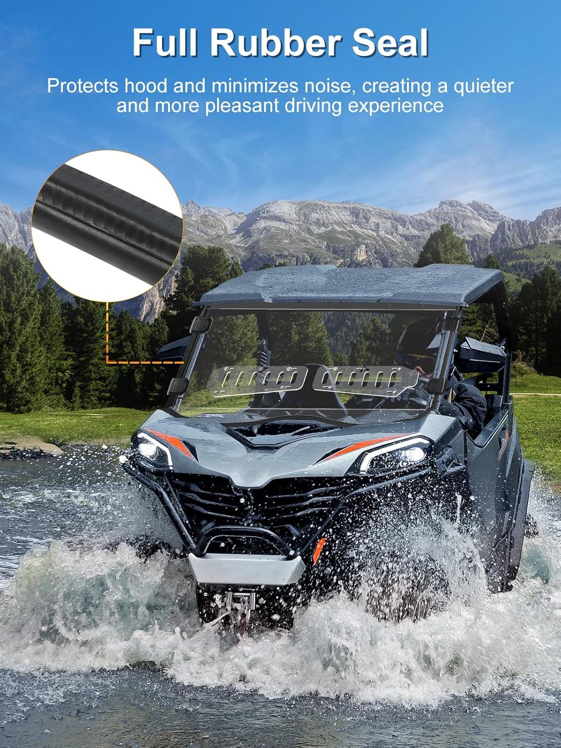 Comprehensive Protection: Offers reliable UV protection while shielding your UTV from rain, snow, leaves, and dust. The full windshield keeps your cabin clean and safe, while the noise-reducing rubber seal reduces vibrations and squeaks for a quieter, smoother ride