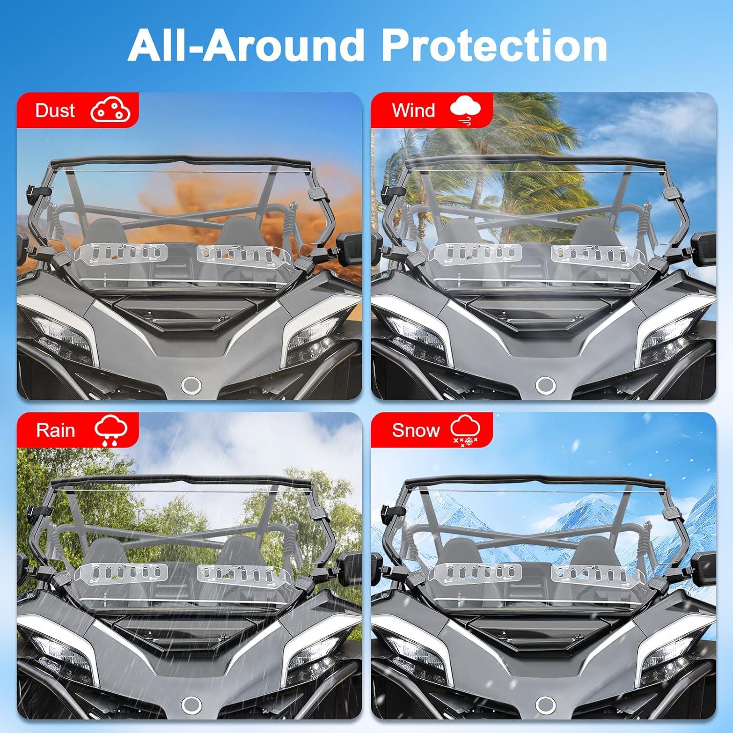 Enhanced Protection & Noise Reduction: Safeguard your ride from wind, debris, and rain while keeping the interior clean and dry. The windshield’s rubber seal protects hood and minimizes noise, offering a quieter and more enjoyable driving experience. Sturdy mounting clamps ensure a stable fit on even the roughest terrain