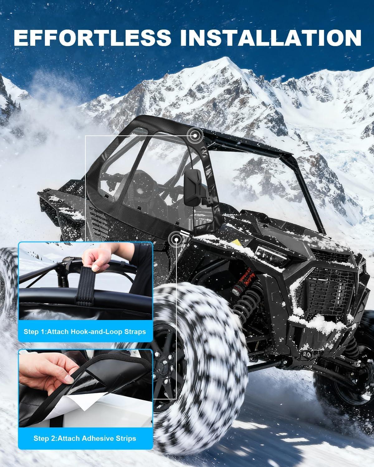 Easy Installation: Easily attach the UTV soft upper doors to your roll cage without any tools. Designed to seamlessly integrate with your vehicle's mirrors, roof, and windshield for a tight, weatherproof seal. Compatible with 2014-2023 Polaris RZR XP 1000, RZR XP Turbo, RZR 900, and S 900 2-seat models
