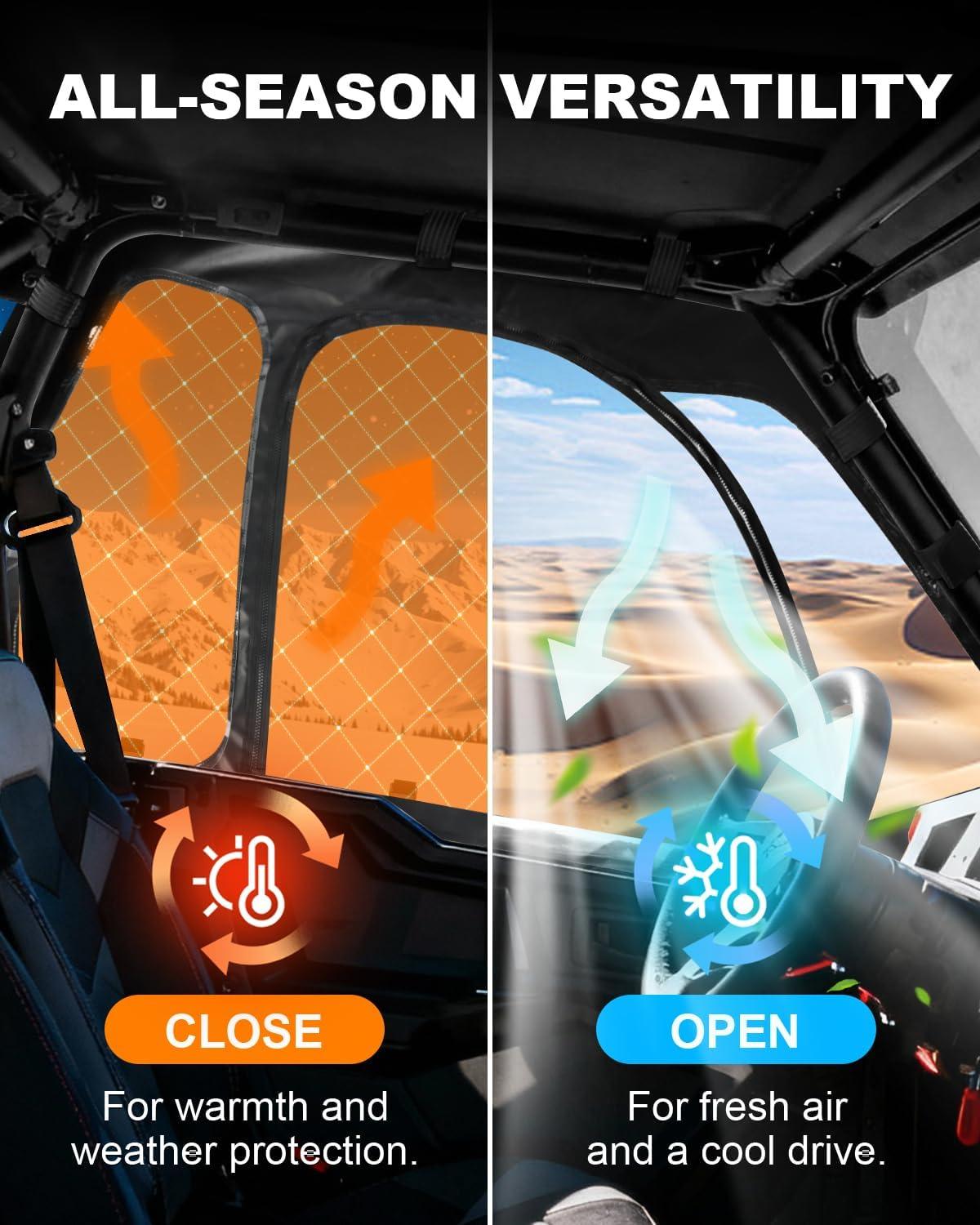 All-Weather Protection: Shield yourself and your passengers from icy winds, sudden downpours, mud, water, snow, and dust with our premium waterproof PVC soft upper doors. Built to keep you dry, cozy, and clean, ensuring no cold, wet, or messy rides—rain or shine