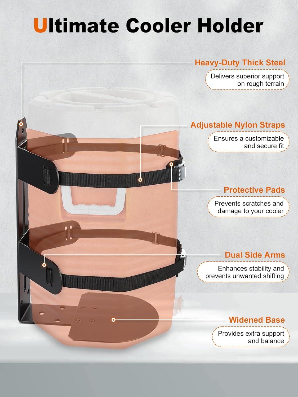 Rock-Solid Stability: Stay worry-free on bumpy roads with a widened base for superior load-bearing support, dual metal side arms that keep the cooler securely in place, and foam padding that prevents scratches and movement. This reinforced design ensures your cooler stays stable, even on rough terrain