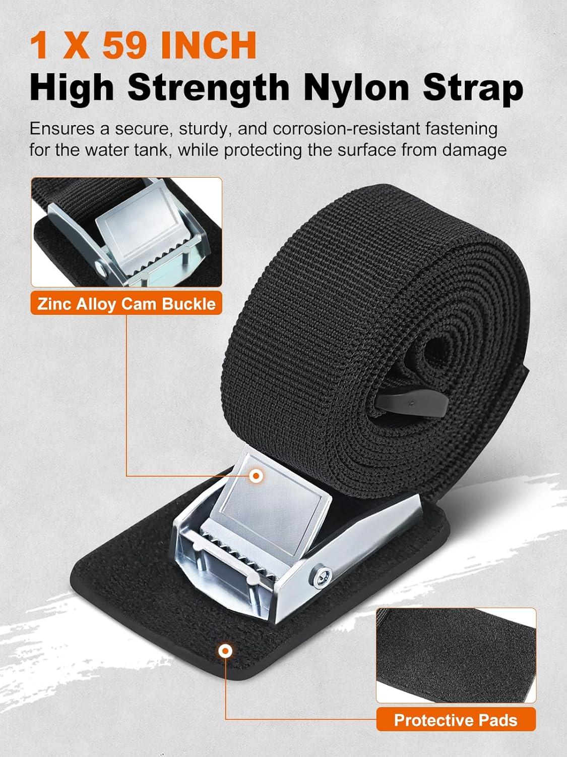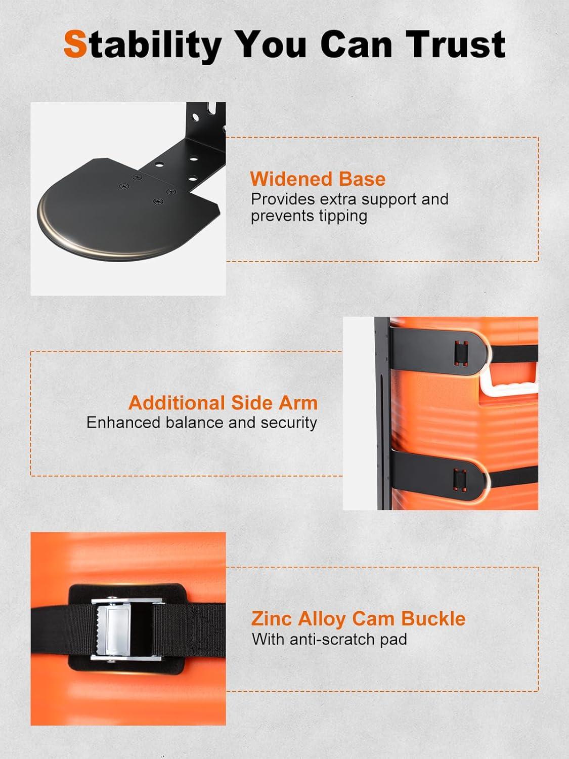 Quick & Secure Mounting: The water cooler holder comes with a 1″ x 59″ high-strength adjustable strap and a zinc alloy cam buckle with a protective pad, this rack offers a fast, firm hold while allowing easy detachment. All necessary hardware is included for a hassle-free installation