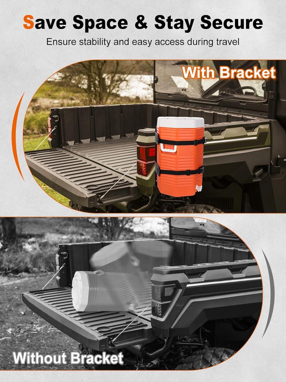 Maximize Space: This water cooler rack mounts securely to open utility trailers, trucks, UTVs, tractors, and lawn mowers, keeping your cooler in a designated spot without taking up valuable space. It helps maintain a tidy, organized setup, ensuring quick and easy access to water during work, travel, or outdoor adventures
