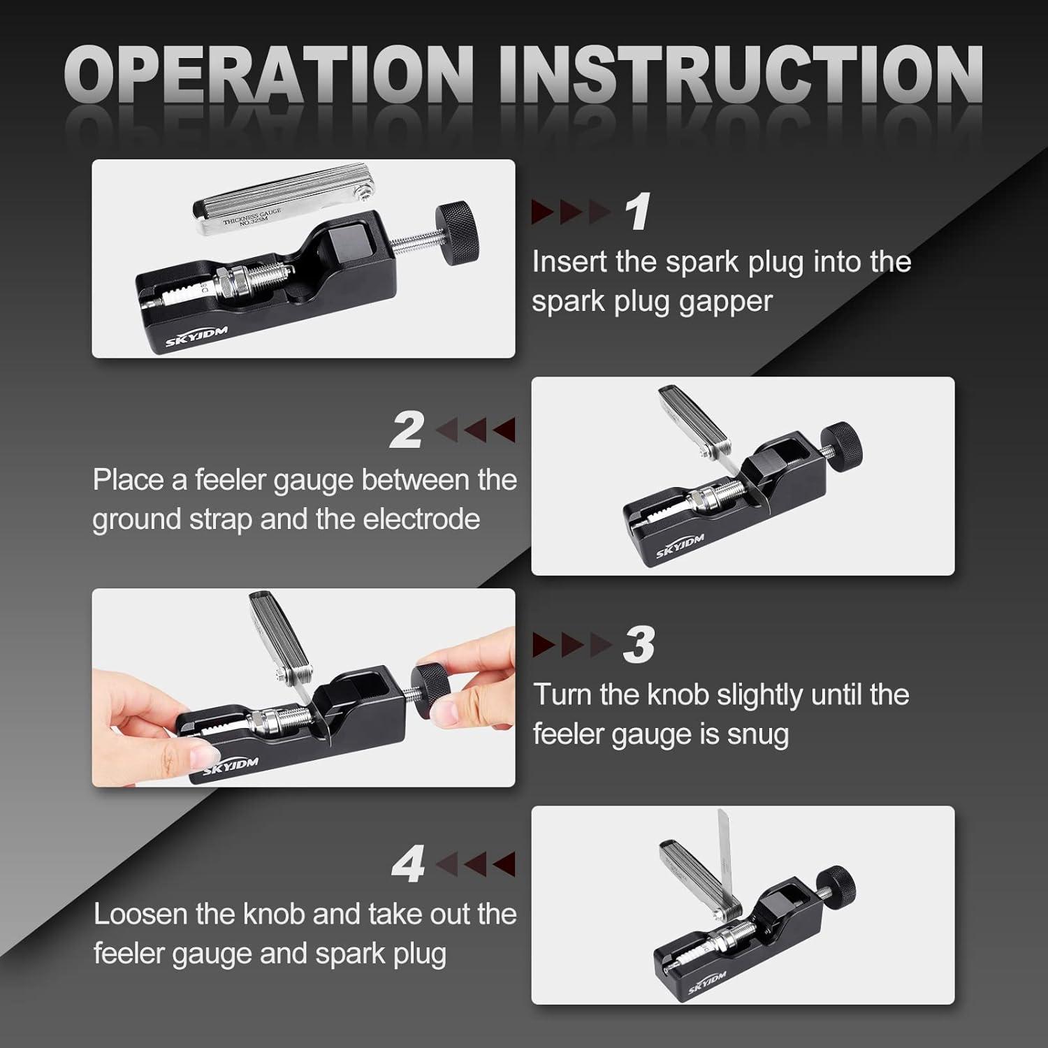 Easy to use: insert the spark plug into the spark plug gapper, place a feeler gauge of the desired thickness between the ground strap and the electrode, and turn the knob slightly until the feeler gauge is snug