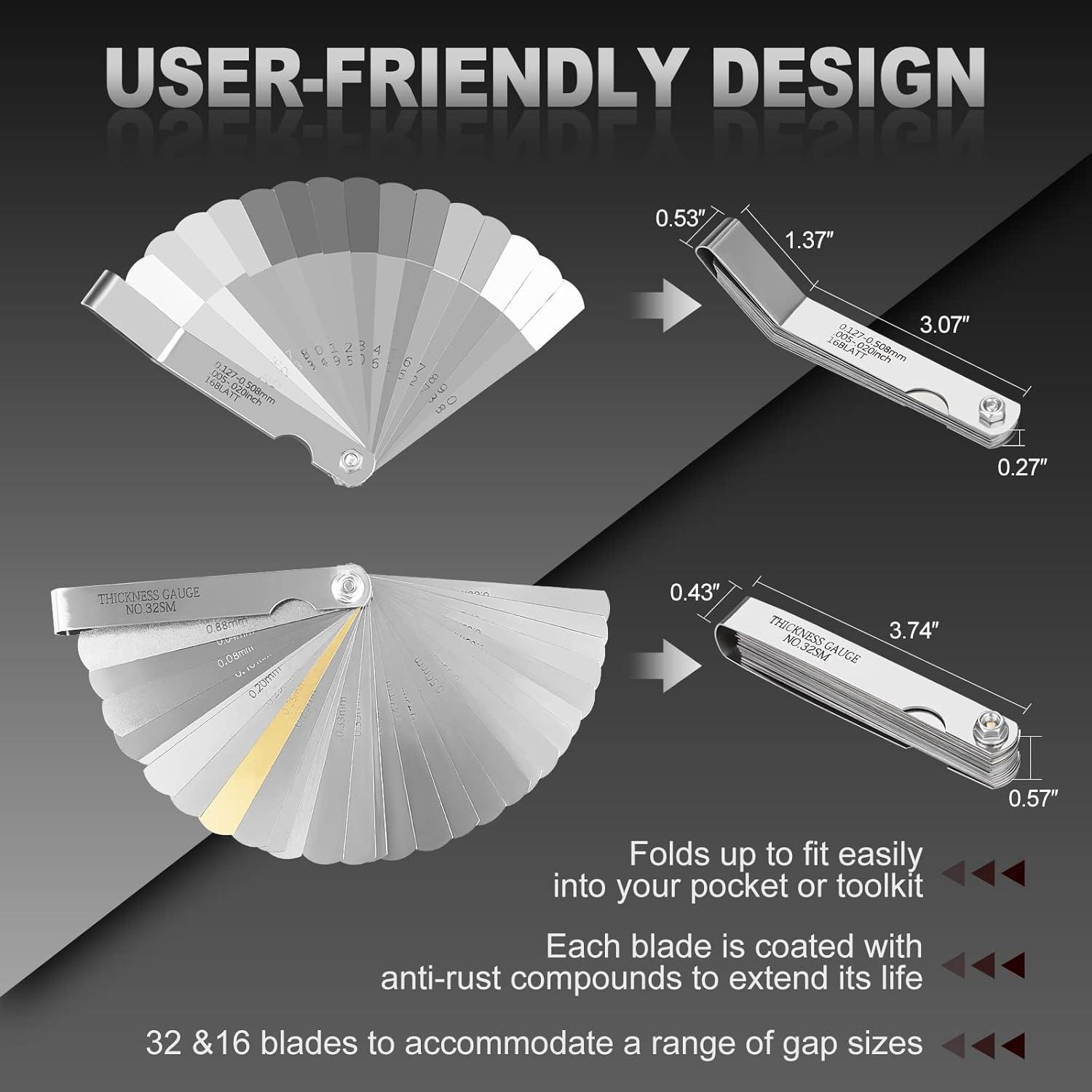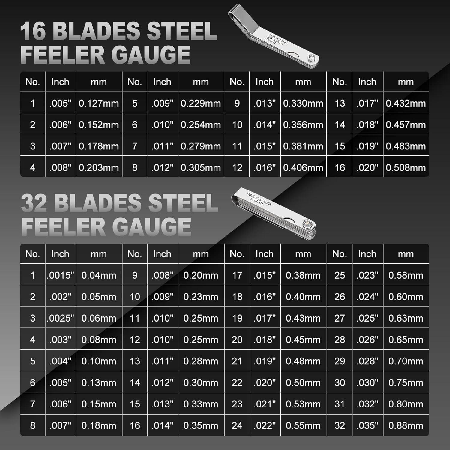 Package includes: 1x spark plug gap tool + 1x 32 blades feeler gauge + 1x 16 blades feeler gauge. (Warm tip: There is some anti-rust oil on the stainless steel feeler gauge to prevent rusting, please feel free to use it)