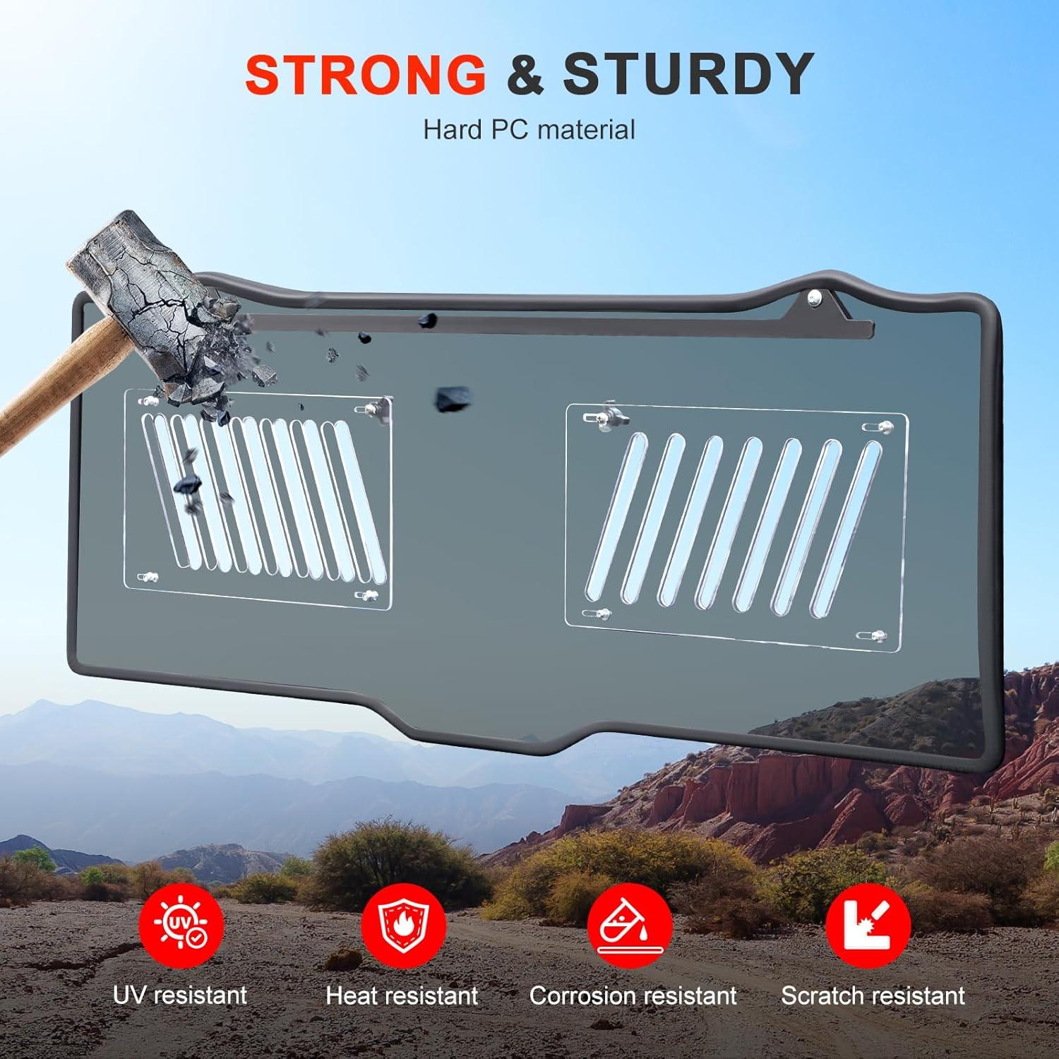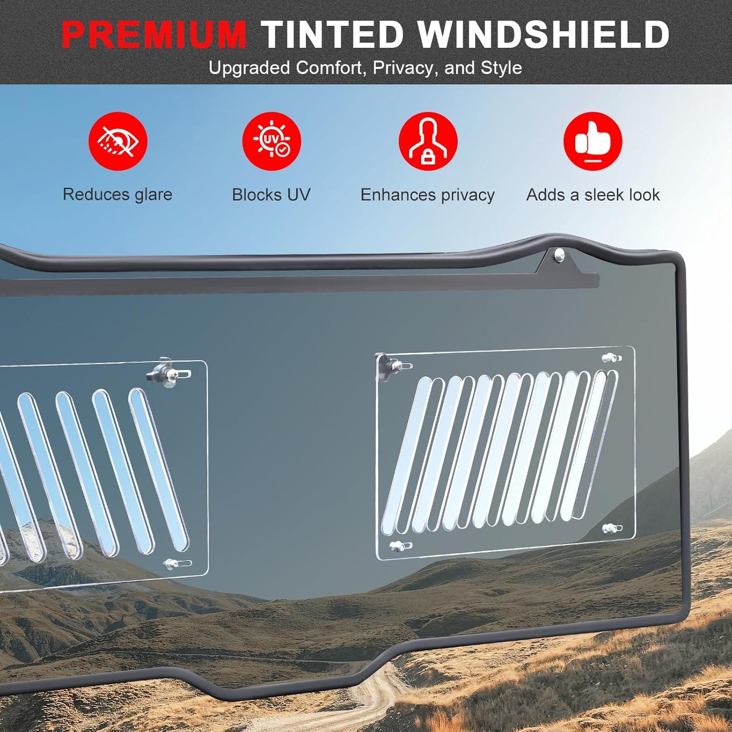 Smoke Tinted Windshield: This tinted rear windshield reduces glare and provides UV protection, minimizing direct sunlight during long drives. Made from polycarbonate (PC), it is 250 times stronger than glass and has a scratch-resistant surface for lasting clarity. Additionally, it enhances privacy and gives your vehicle a sleek, upgraded appearance